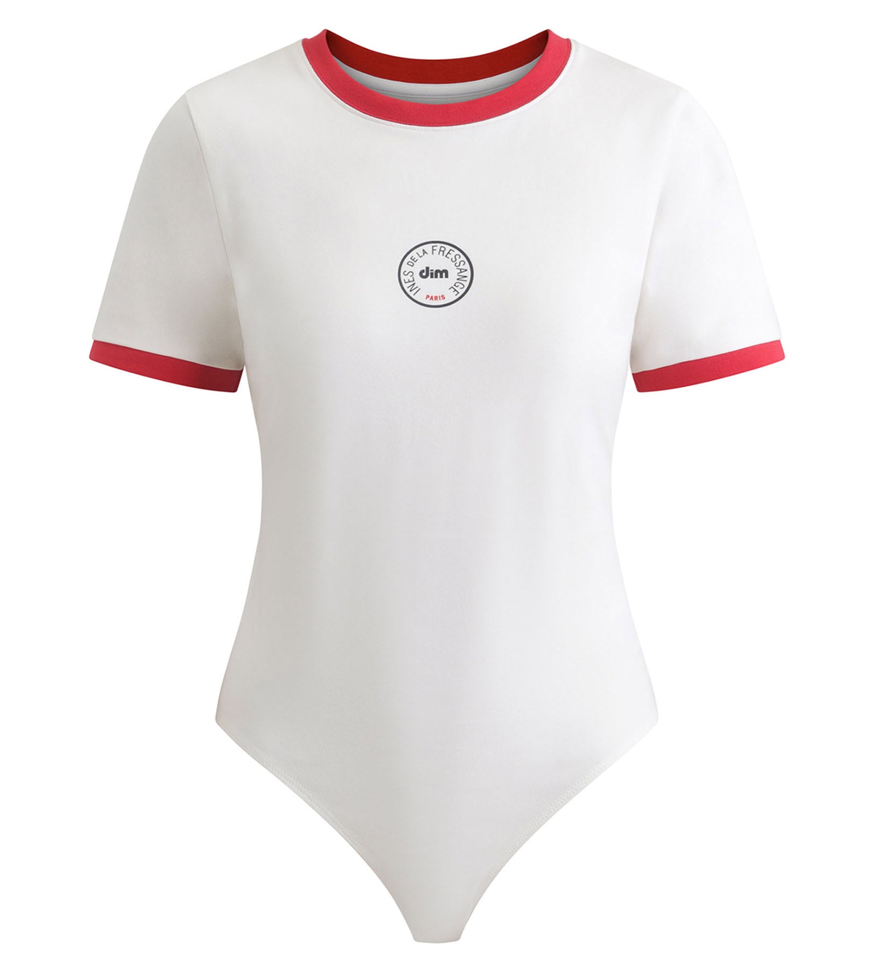 Adopta un estilo sporty chic con el body de mujer Dim x Inès de La Fressange Nacre, trenzado con un cuello rojo en contraste.