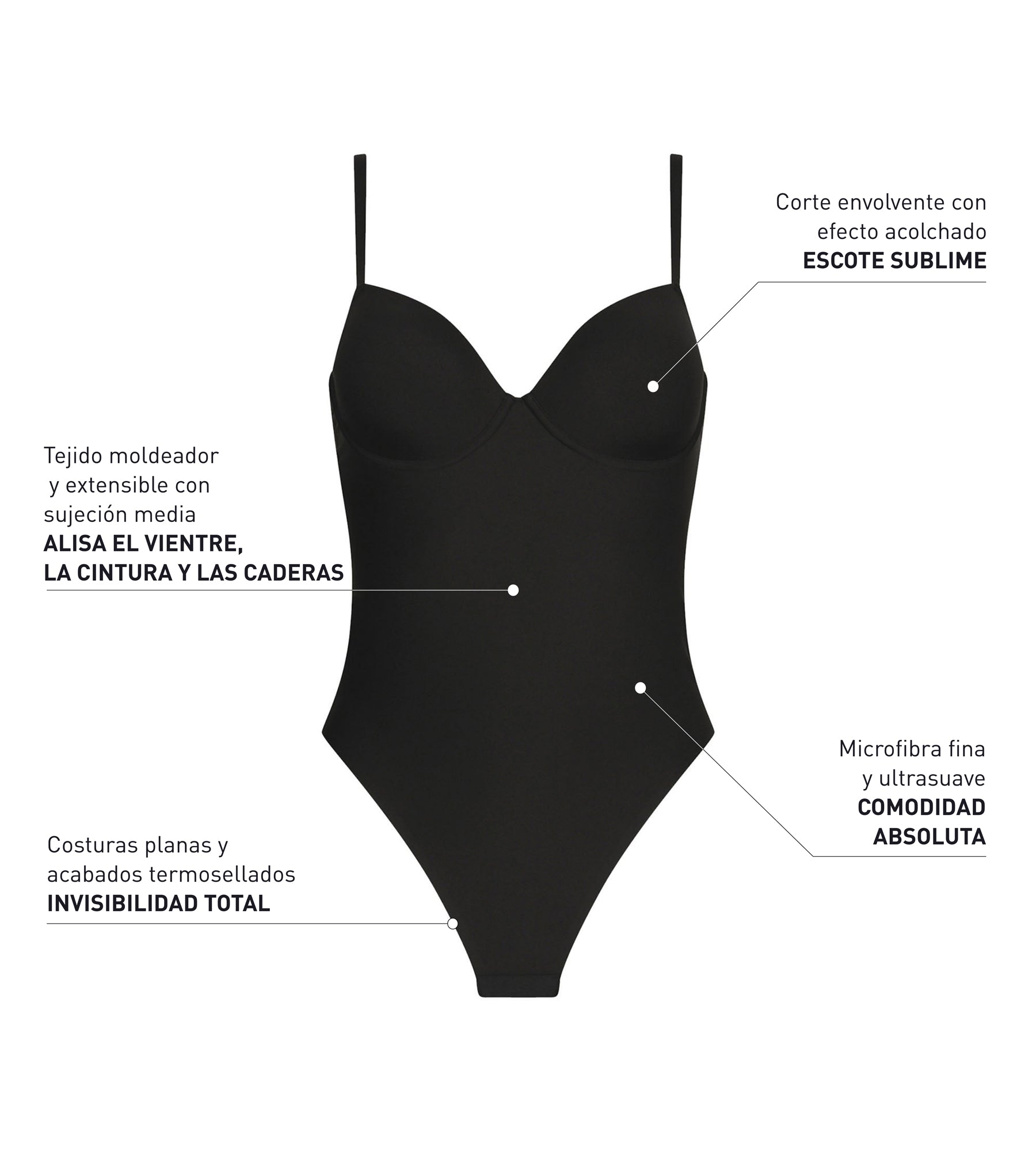 - INVISIBILIDAD TOTAL: Gracias a su microfibra fina y a los dobladillos pegados, este body-tanga permanece discreto e invisible bajo tus prendas.