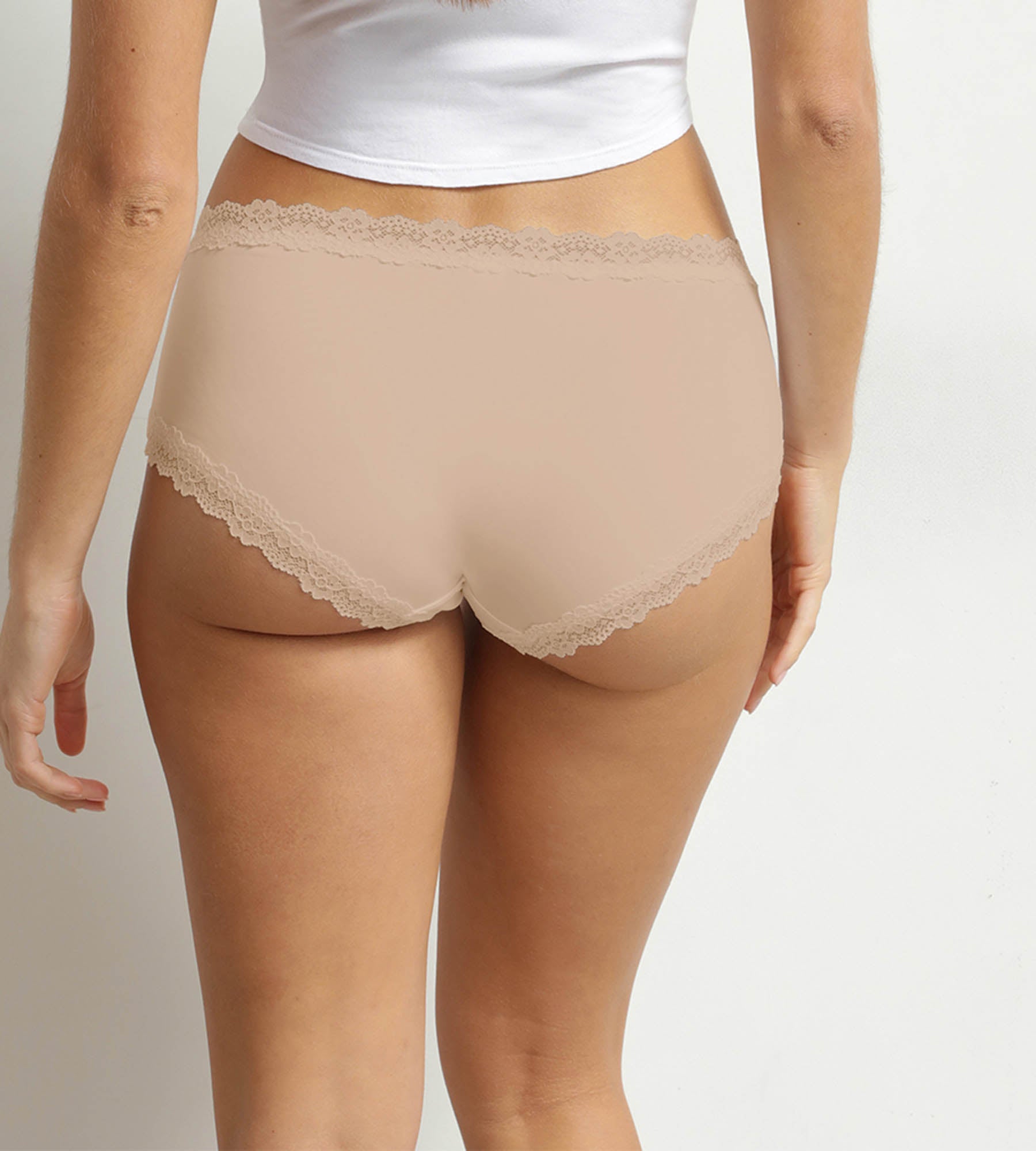 Este shorty para mujer se olvida por completo gracias a su fina microfibra que se desliza sobre la piel sin dejar marcas. El color nude se funde de forma natural bajo la ropa clara o transparente. El corte shorty sujeta sin apretar, mientras que el encaje en los bordes añade un toque femenino que permanece discreto, incluso bajo la ropa ajustada. Una prenda básica para el día a día que apuesta por la comodidad inmediata con un acabado refinado, para unos bóxers de mujer de encaje tan prácticos como elegantes.