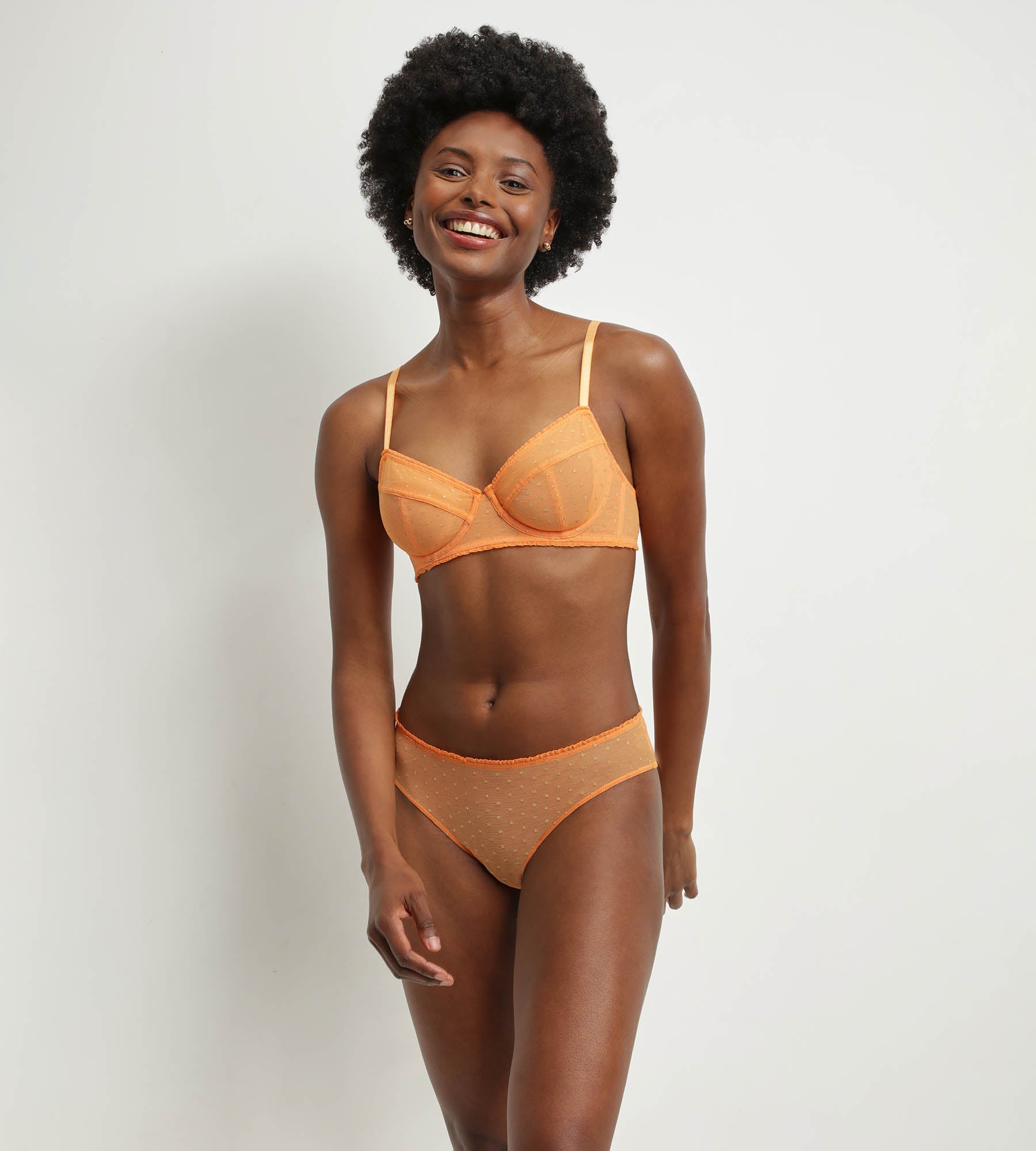 El talle es alto, de estilo más retro y revela las caderas y nalgas con sensualidad. En esta versión naranja brillante con lunares en lúrex brillante el tanga es más desenfadado. La tienes también en negro, así como las otras piezas de la gama Shiny Mesh. ¡Para un estilo glamuroso combínalo con el bralette a juego!