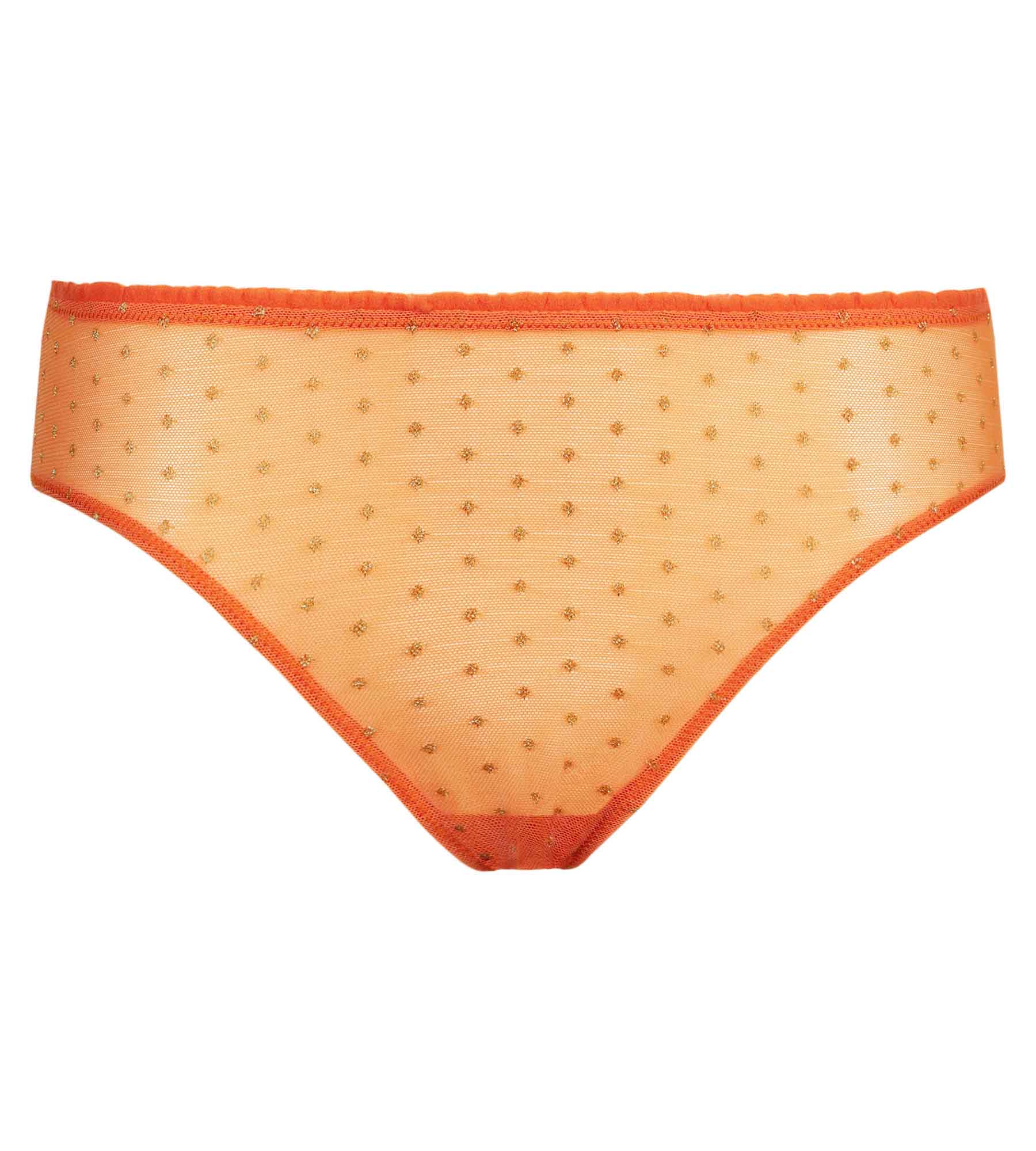 Sucumbe al estilo sensual y festivo de la braga brasileña de tul naranja con lunares y volantes Shiny Mesh de Dim
