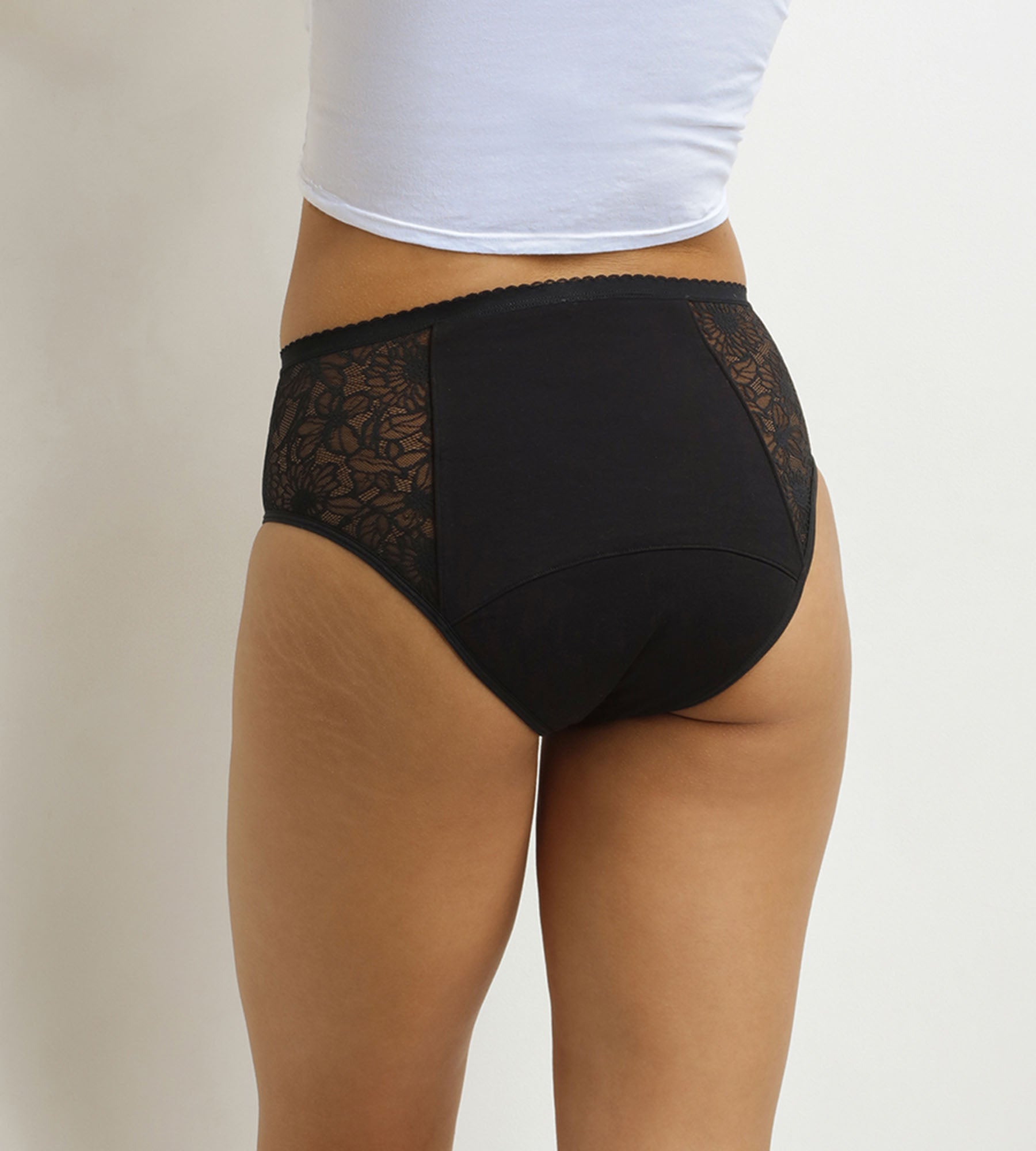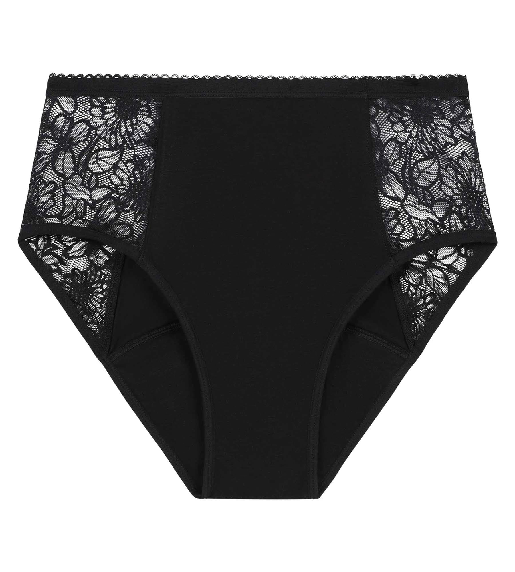 Adopta las braguitas menstruales Dim Protect de algodón orgánico y encaje floral negro: una protección fiable y femenina para flujos muy abundantes.