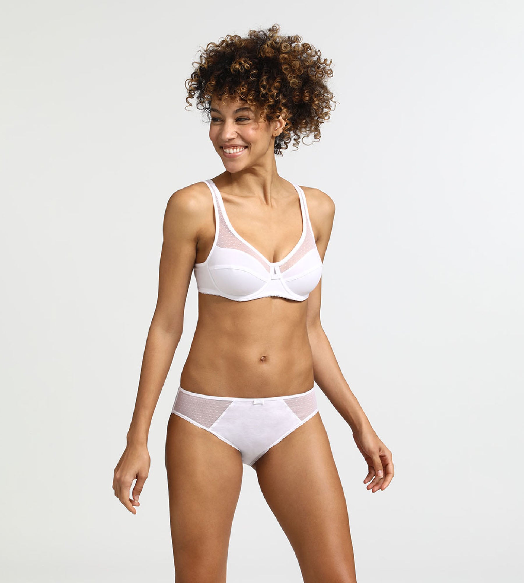 Acentúa tus preciosas formas con la braguita blanca Generous Coton Bio Dim. Ultrasuave gracias a su algodón bio supercómodo, esta braguita para mujer juega a las transparencias con sus detalles femeninos en las caderas. Para un precioso conjunto blanco, combínala con el sujetador de gran capacidad con aros blanco Generous Coton Bio a juego.