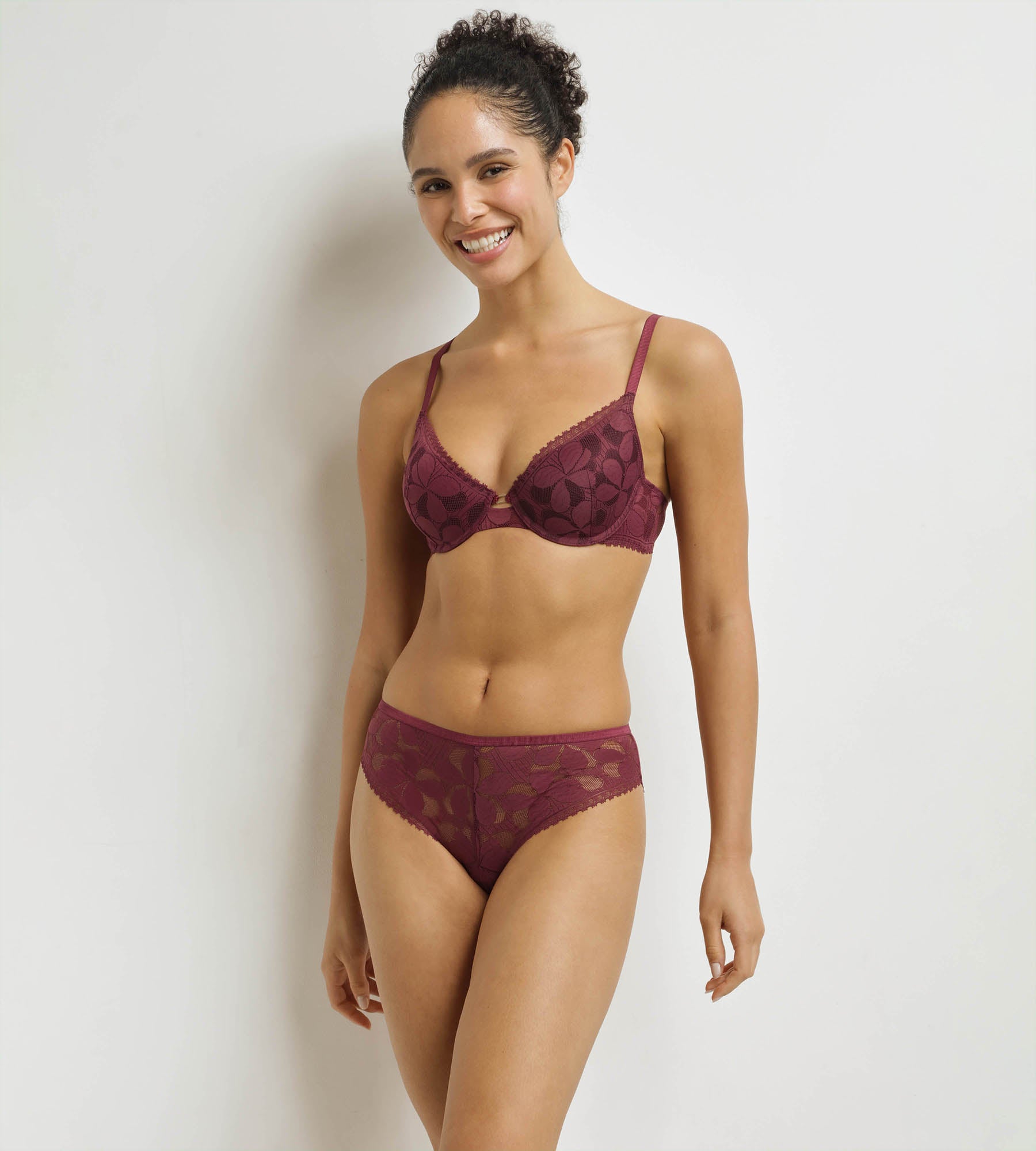 Combina las braguitas de encaje Art Flower con el sujetador de triángulo, corbeille o emboicirc;tant de la misma colección, a juego en Fig o Acid Orange!