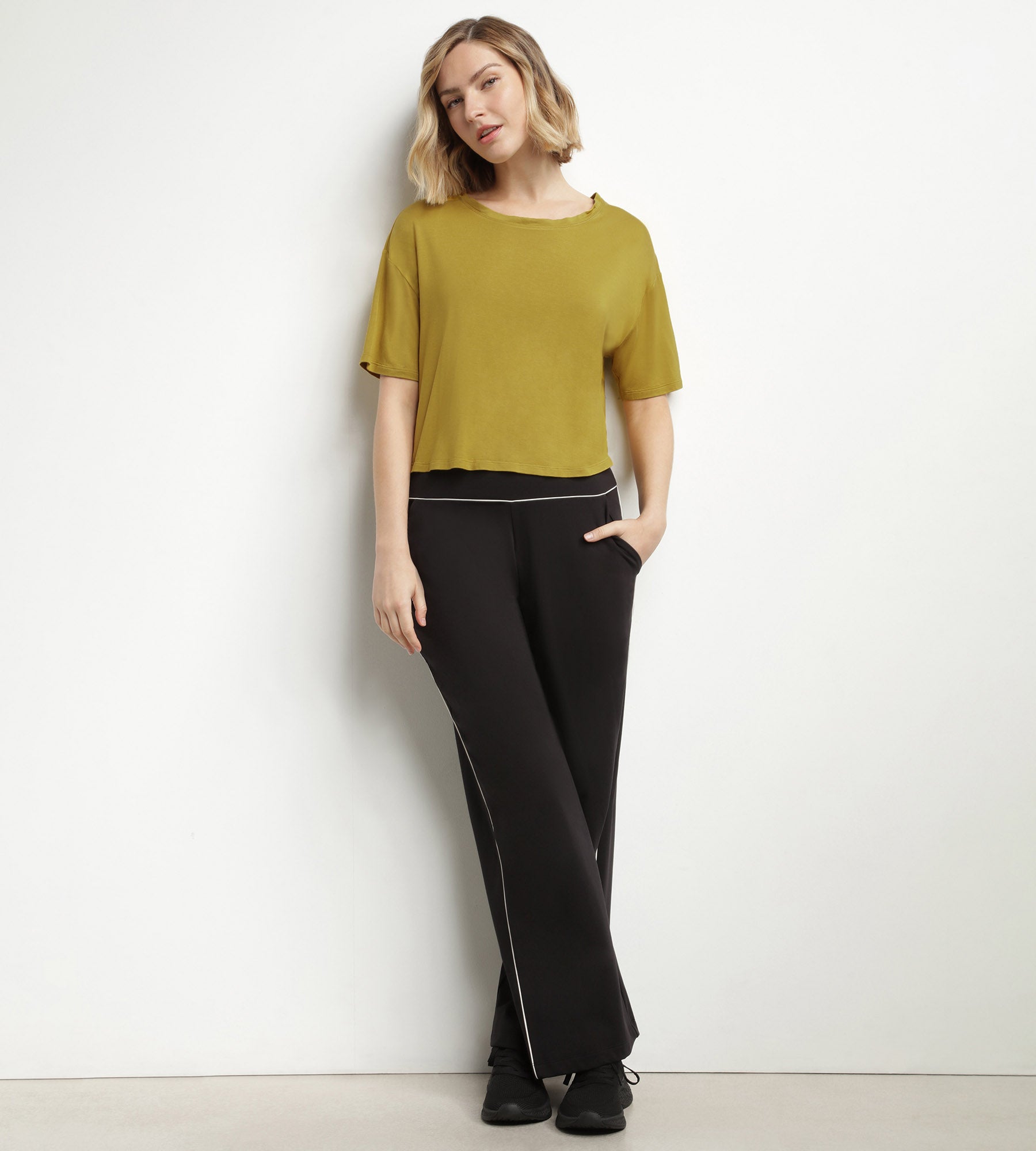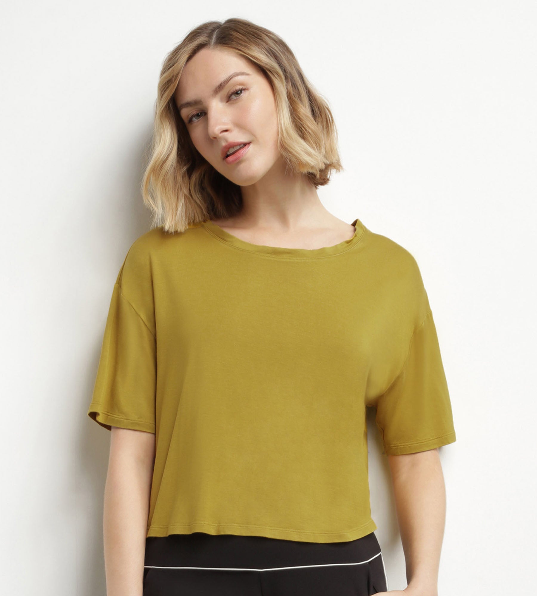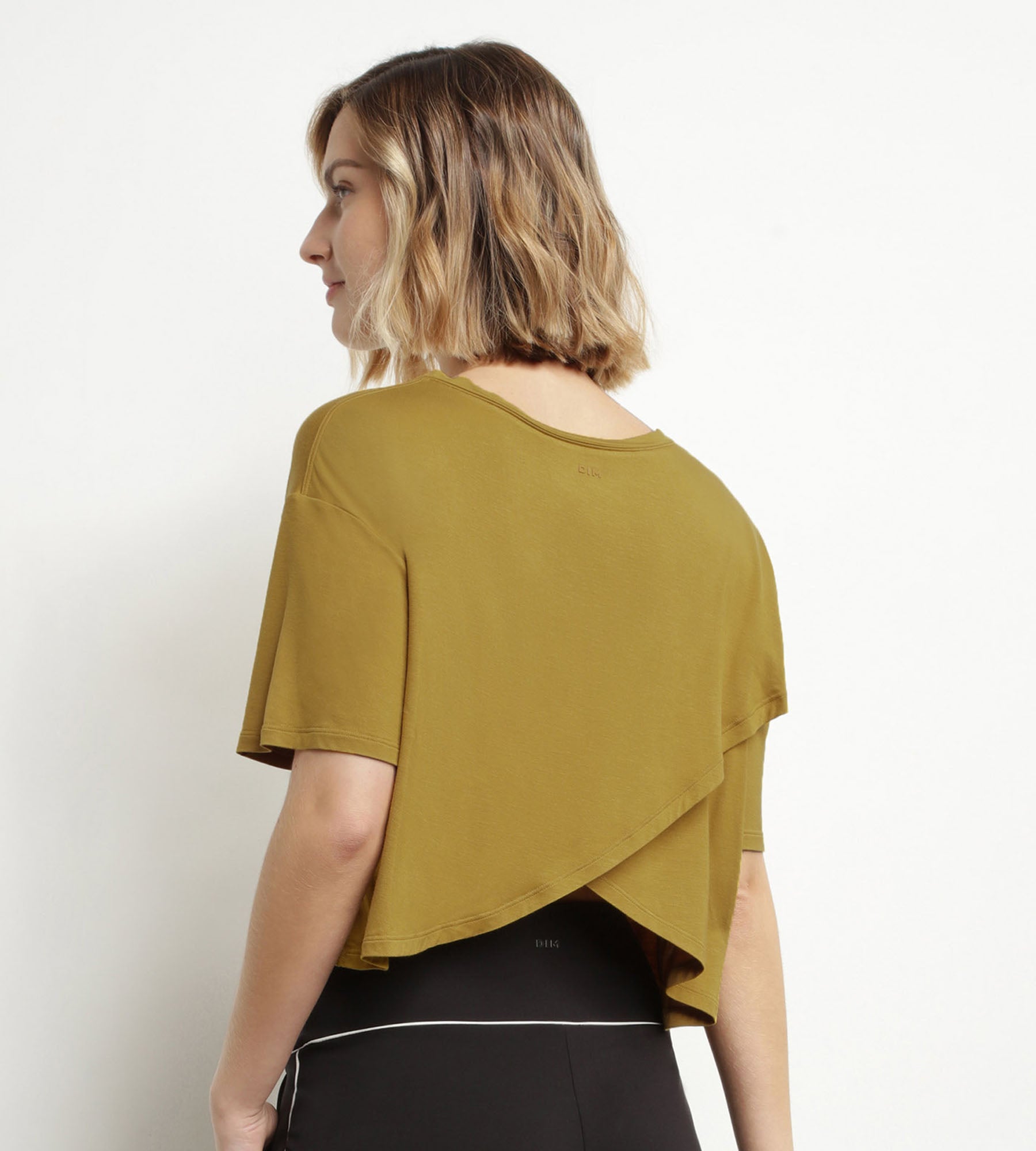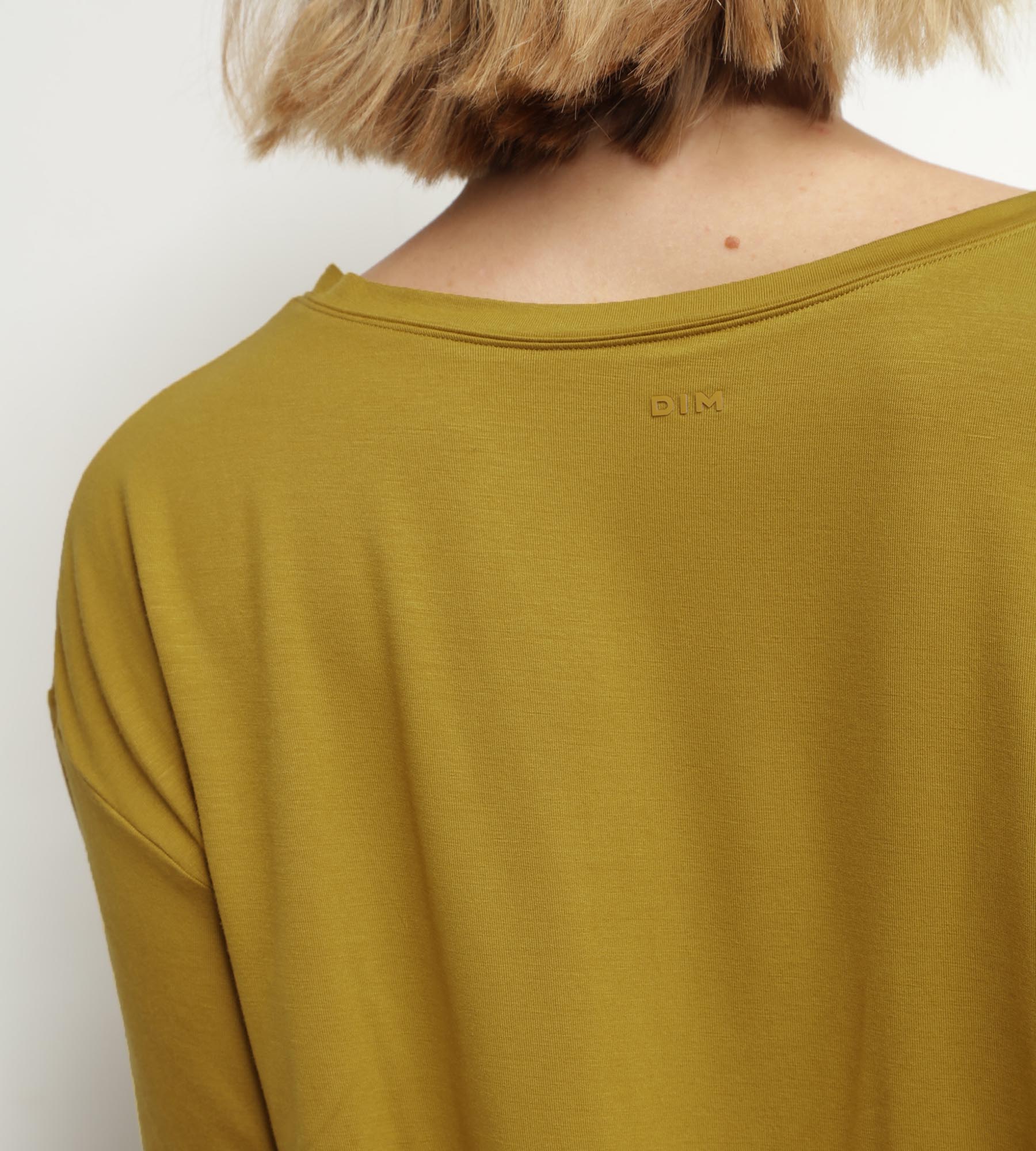 Ideal para hacer deporte con estilo, libertad y comodidad, esta camiseta deportiva de viscosa verde oliva se puede combinar con nuestros sujetadores y culottes deportivos de la misma gama Dim Move.