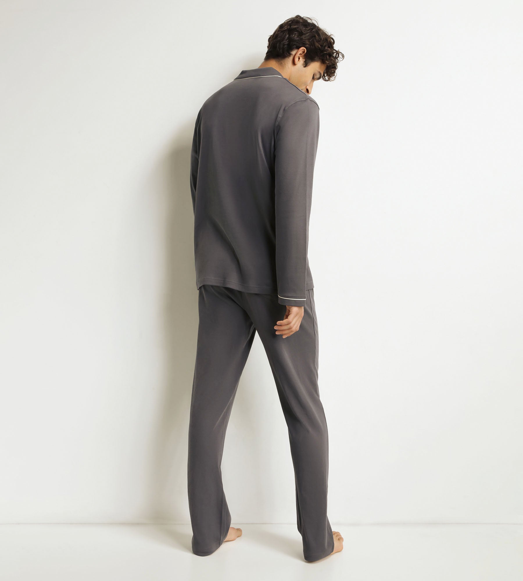 Estos pijamas para hombre presentan un corte clásico y un estilo inspirado en el armario de vestir. La parte superior de estilo camisero, con cuello sastre y botones, se combina con unos bajos rectos y fluidos que se ajustan a la cintura. El punto interlock proporciona un tacto suave y un ajuste cómodo, perfecto para las noches de frío. Los acabados en contraste añaden un discreto toque gráfico, para un look informal y pulido.