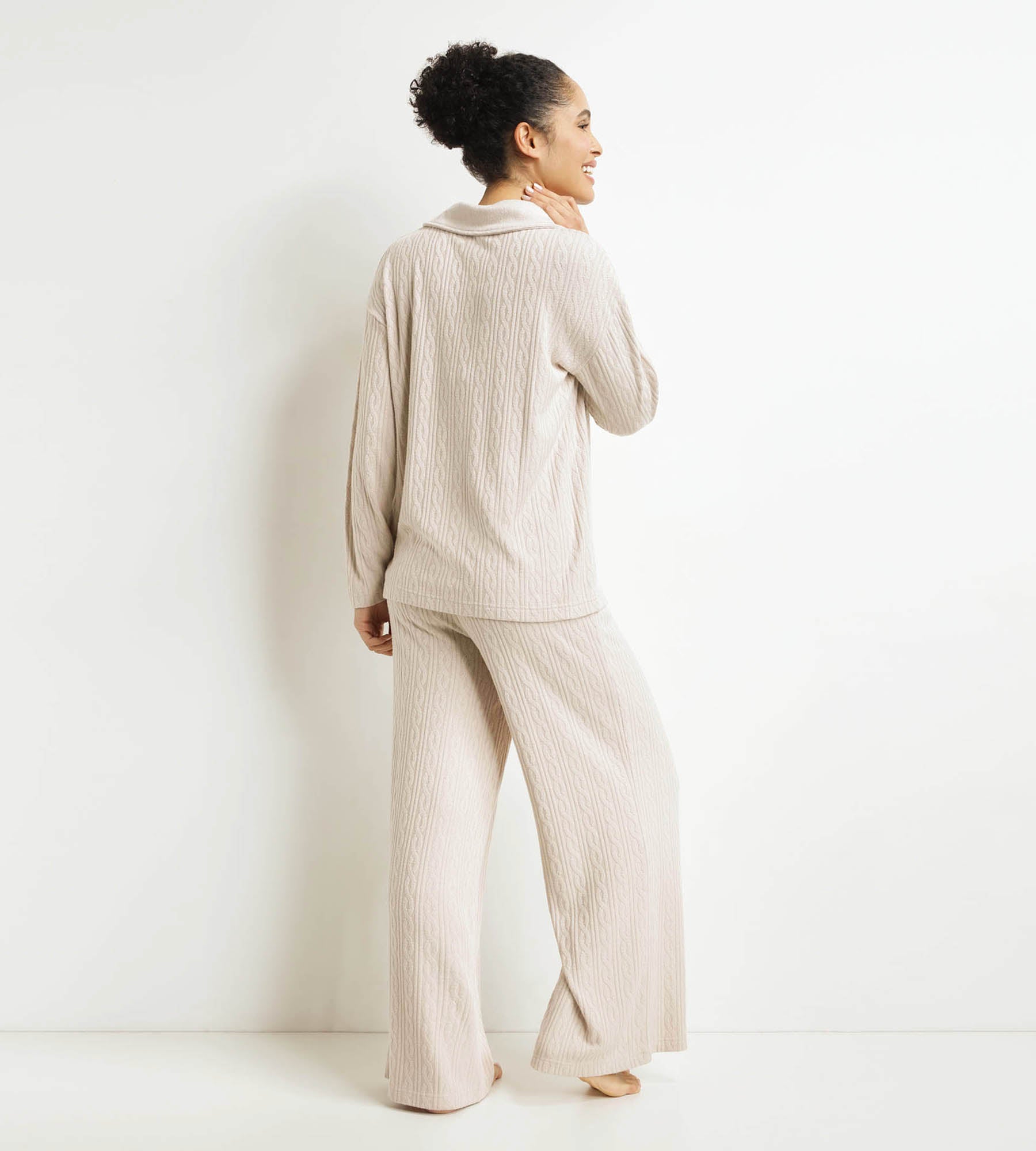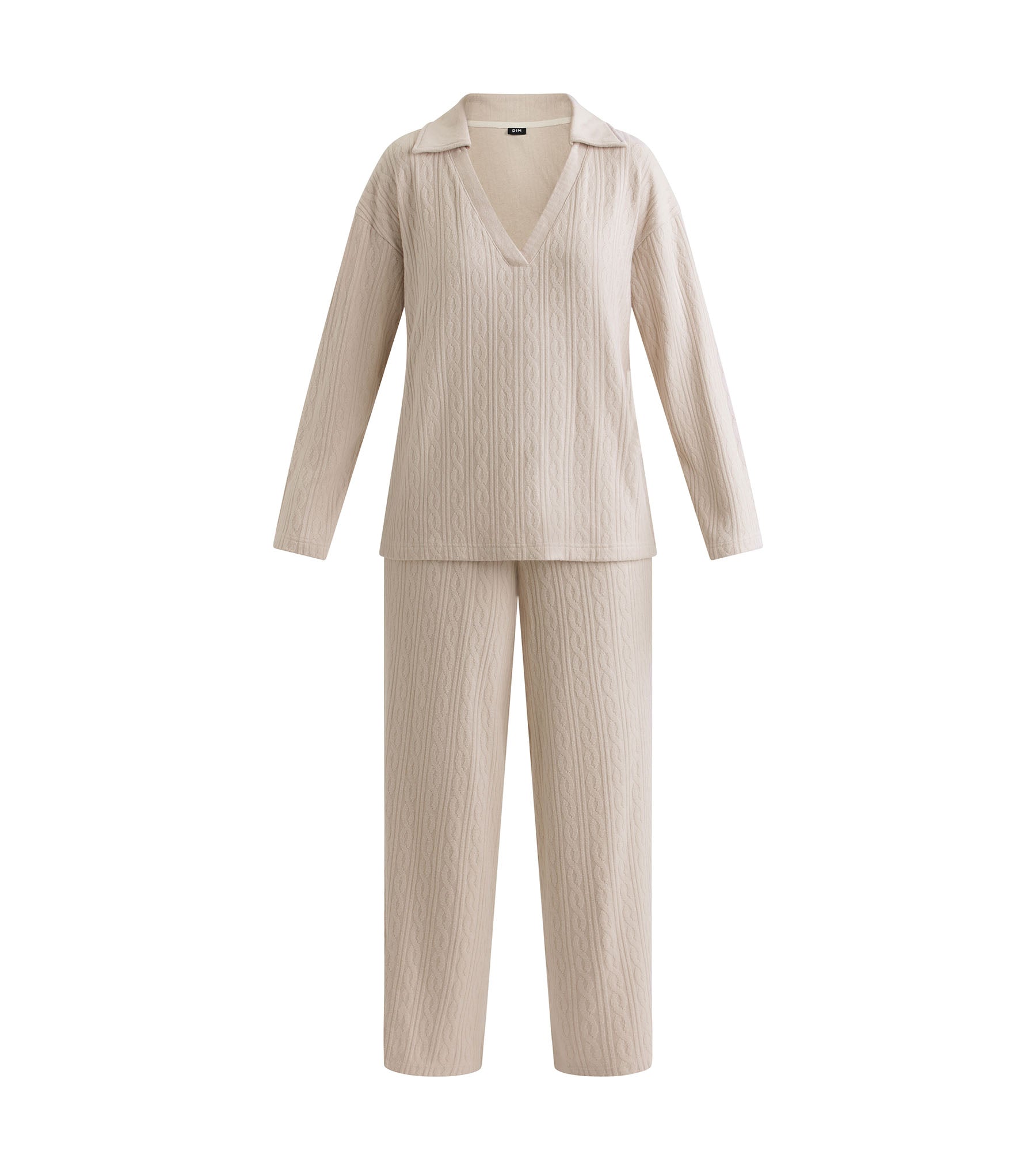 Sumérgete en la comodidad con este conjunto de pijama para mujer de DIM Warm en punto trenzado de color marfil: una mezcla perfecta de elegancia informal.