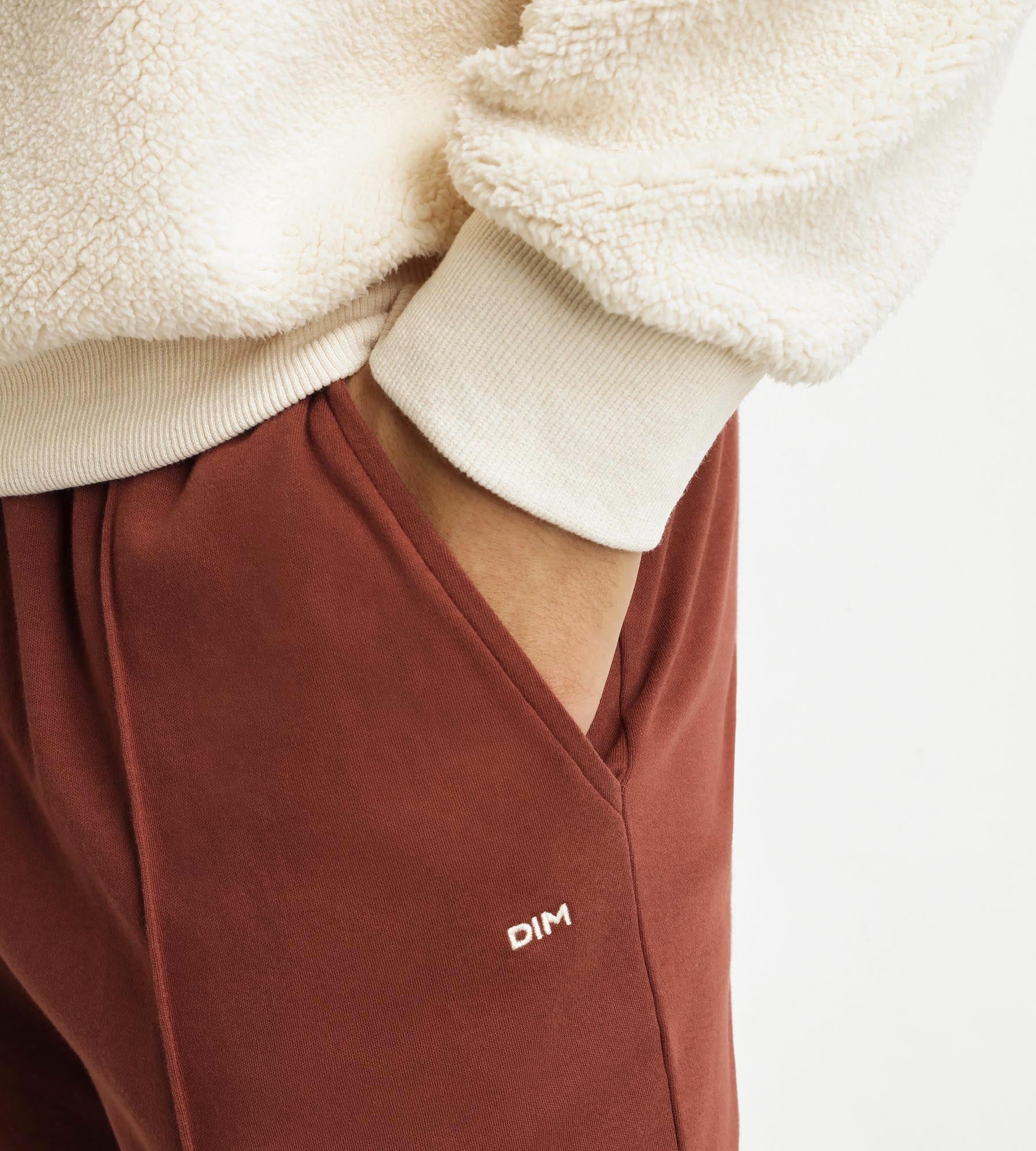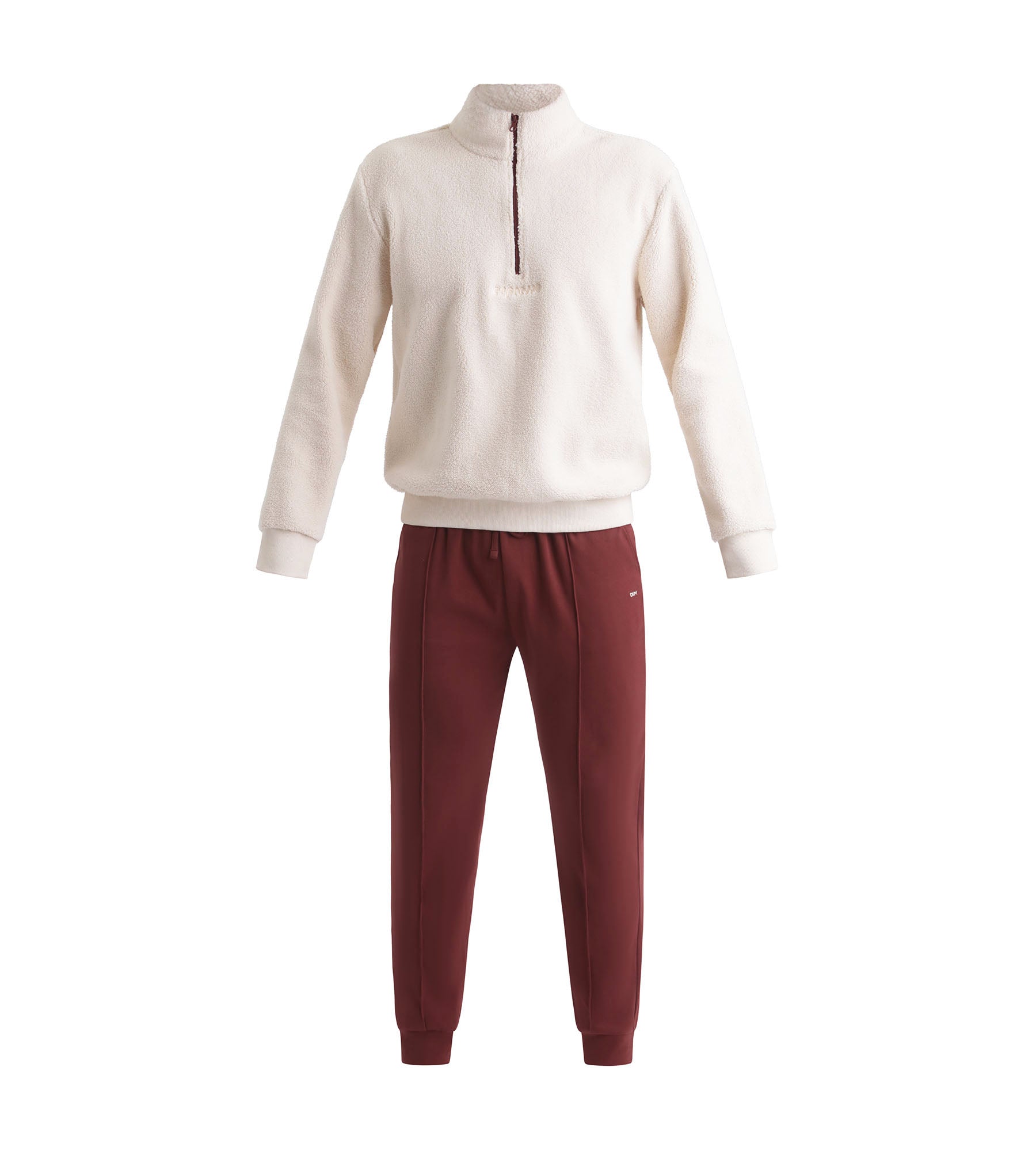 Para un estilo acogedor y urbano, opta por el pijama pantalón para hombre de Dim en efecto lana de cordero marfil y burdeos.
