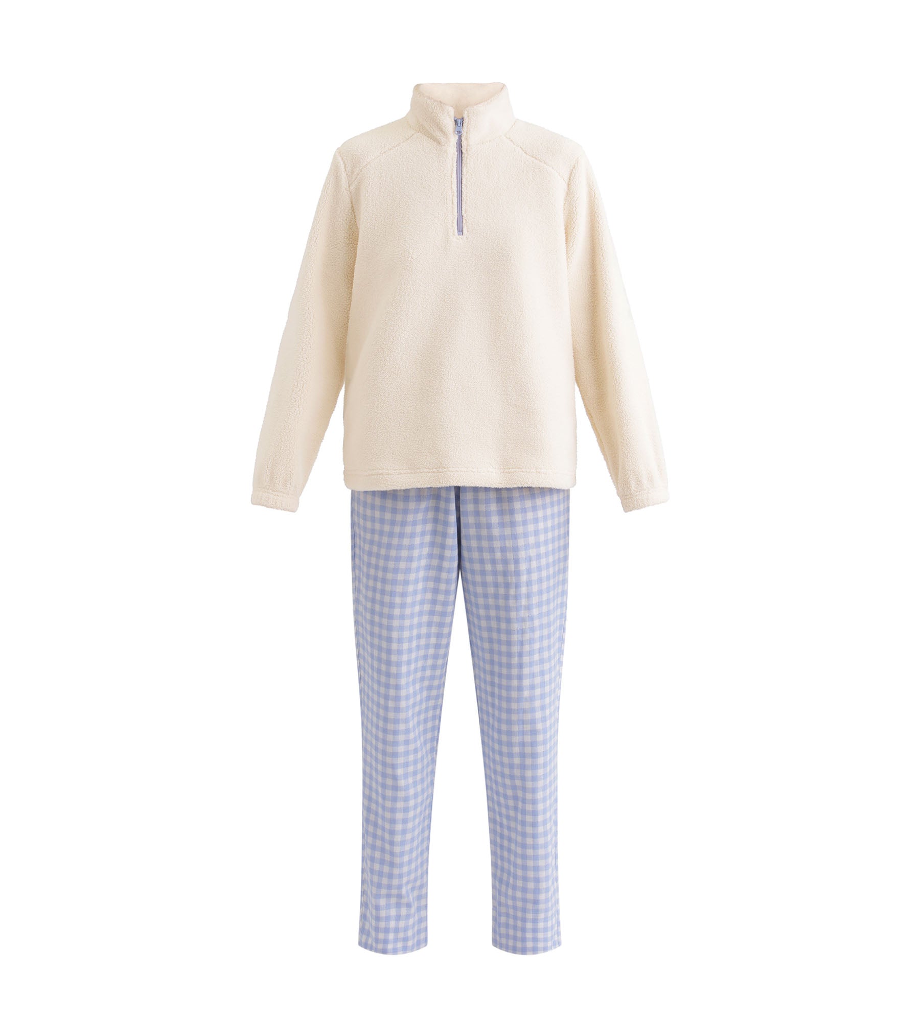 Cómodo y moderno, este pijama de mujer Dim juega con los contrastes para combinar suavidad y estilo. El top gris claro texturizado está adornado con un cuello camionero con cremallera y un trenzado en contraste, para un toque sporty chic. El pantalón recto de franela azul con estampado de cuadros añade un toque gráfico. Fácil de poner y cómodo de llevar, este pijama de mujer es tu compañero diario para los momentos de relax en casa.