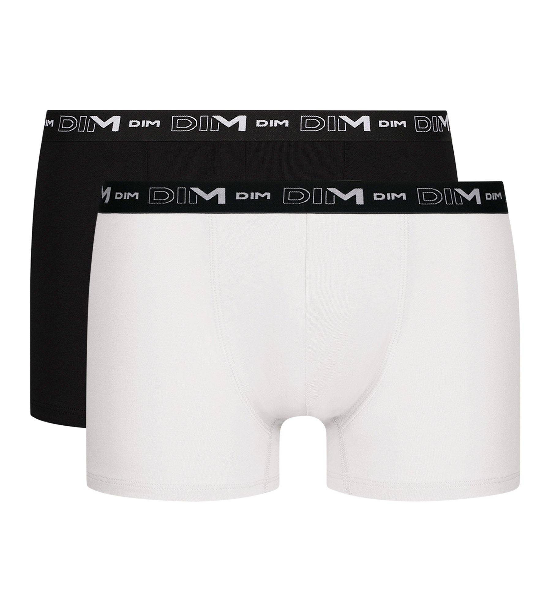 Combina comodidad y estilo atemporal con el set de 2 bóxers de algodón elástico blanco y negro para hombre de Dim.