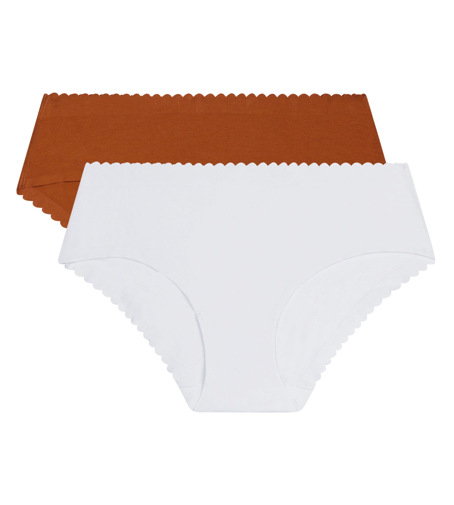 Déjate seducir por la suavidad de nuestro pack de 2 braguitas invisibles Body Touch Easy de algodón elástico blanco y marrón canela cálido.