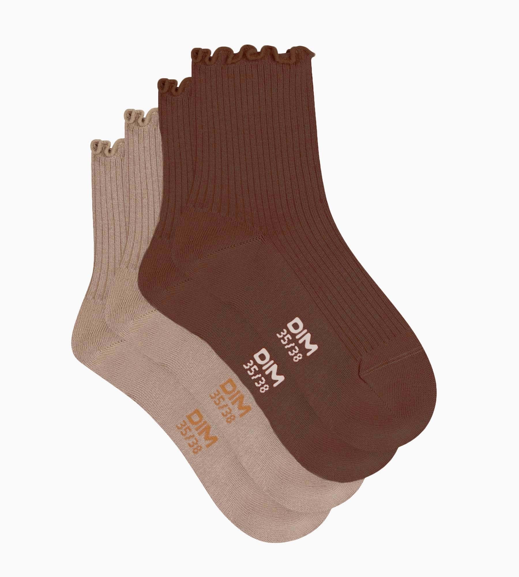 Aporta un toque cálido y femenino a tus conjuntos con este pack de 2 pares de calcetines de mujer Dim de algodón modal color topo/cappuccino y delicado borde ondulado.