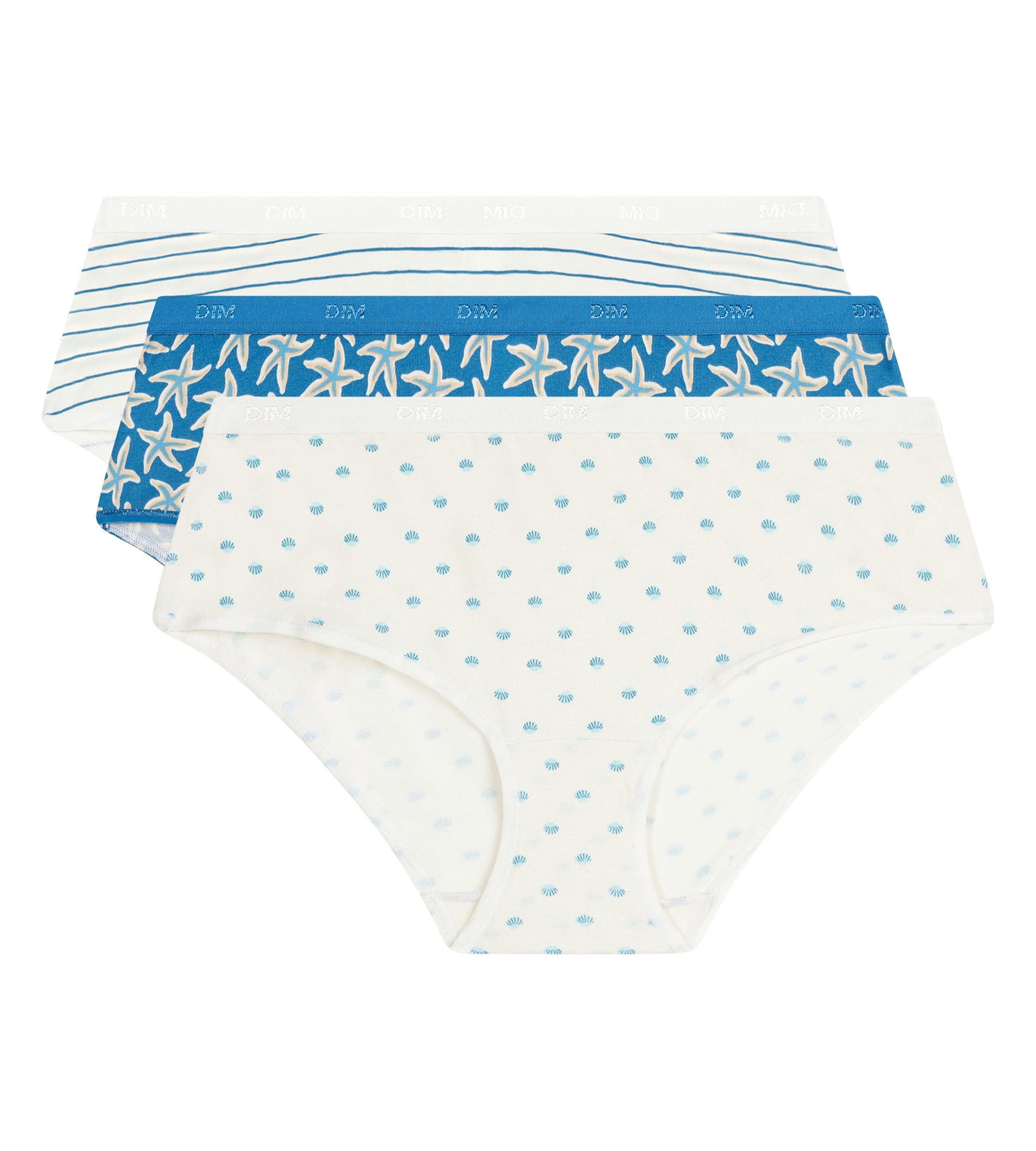 En este pack Les Pockets de Dim, los bóxers de algodón para mujer se inspiran en el mar con tus delicados motivos marinos. Entre rayas finas, estrellas de mar y pequeñas conchas, cada modelo se distingue por su propio estilo. La paleta mezcla tonos naturales y frescos para un resultado luminoso y veraniego. Diseñados en un tejido elástico agradable de llevar, estos bóxers para mujer de Dim acompañan los movimientos sin apretar ni marcar la piel.