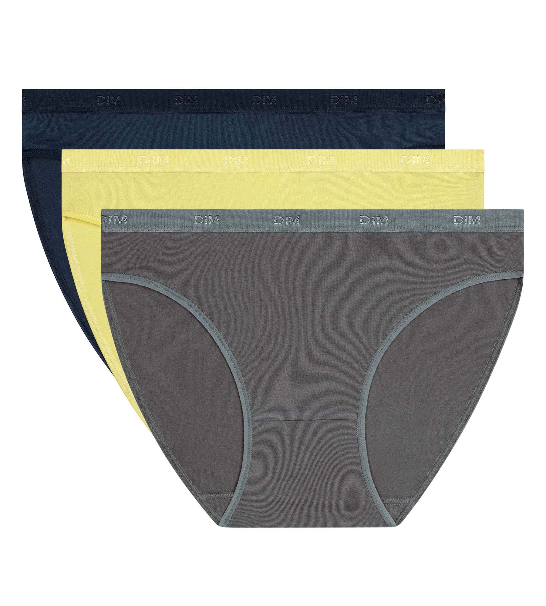Aporta un toque de frescura a tu día a día con este pack de 3 braguitas de mujer de algodón elástico Les Pockets Ecodim en colores azul, gris y amarillo.