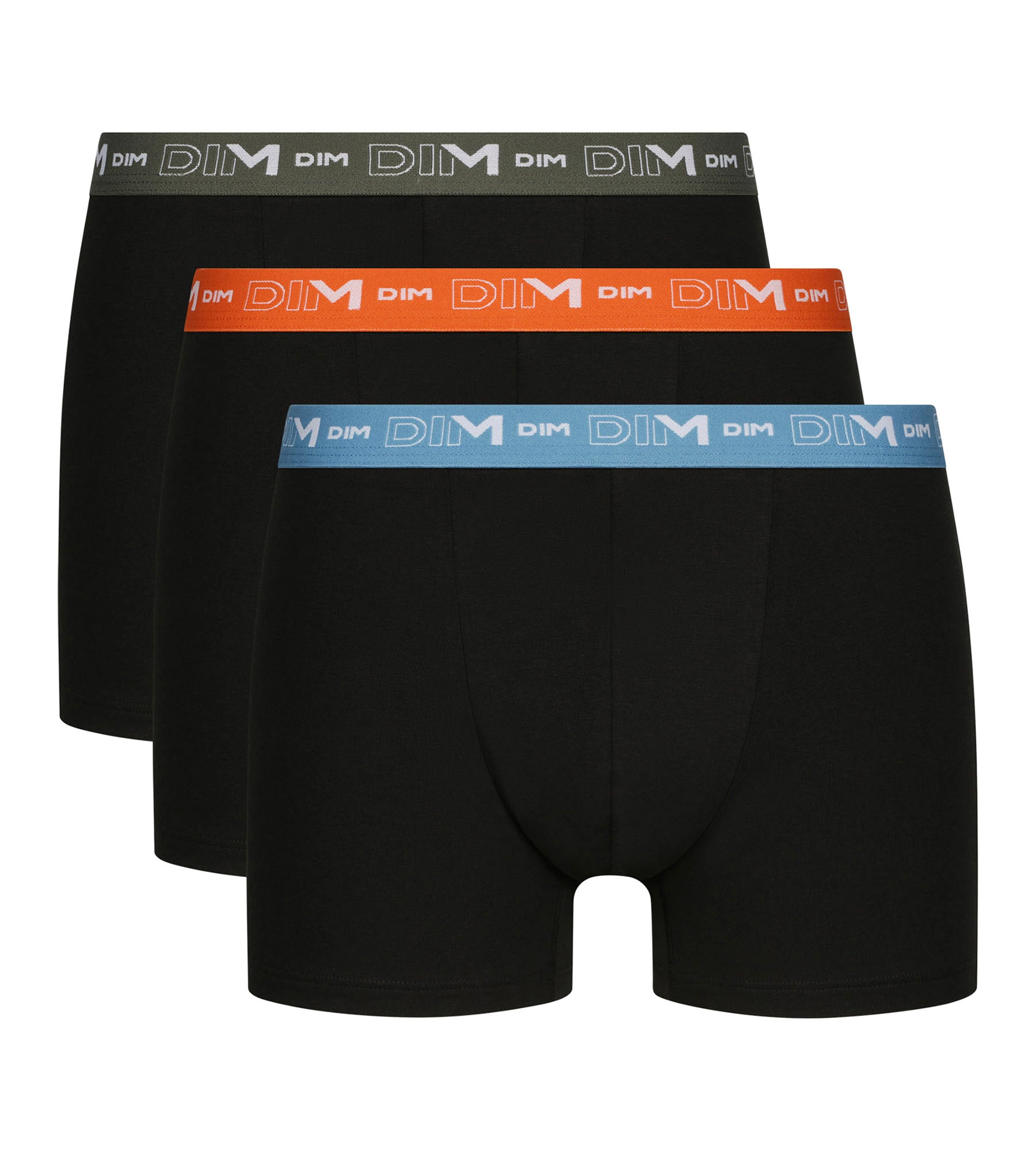 Apuesta por la comodidad y el color con el Pack de 3 calzoncillos negros Dim Coton Stretch para hombre, ¡con cinturilla azul, naranja y verde!