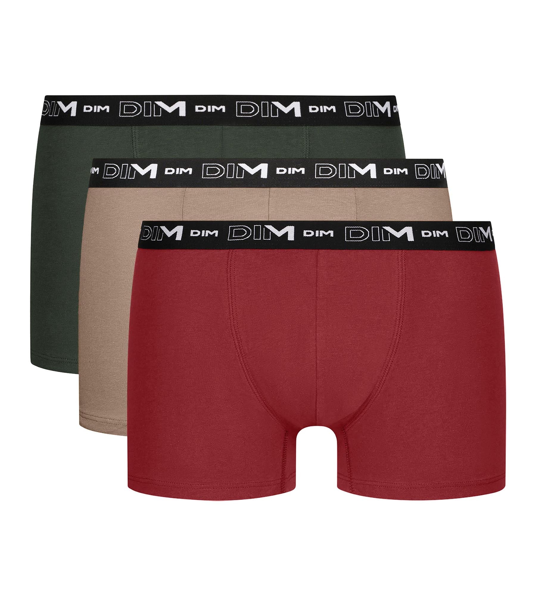 Sazona tu día a día con el set de 3 bóxers elásticos de algodón para hombre de Dim en verde abeto, beige y rojo brillante!