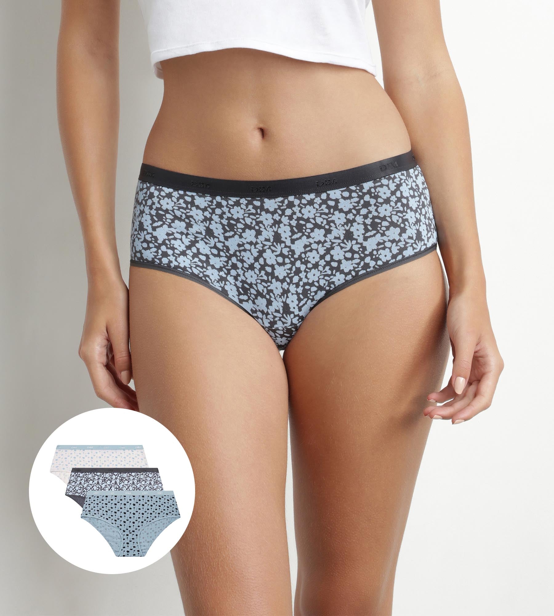 Compuesto por un shorty azul cielo con flores grises y 2 culottes de mujer grises y blancos con flores azules, el Pack de 3 bóxers de mujer de algodón elástico Les Pockets es sobriamente gráfico. Confeccionados en un tejido suave y transpirable con una banda elástica de sujeción, los culottes para mujer Les Pockets ofrecen un ajuste perfecto sin dejar de ser cómodos. Nos encantan los sutiles estampados florales y los tonos relajantes que añaden un toque romántico a tu lencería diaria.