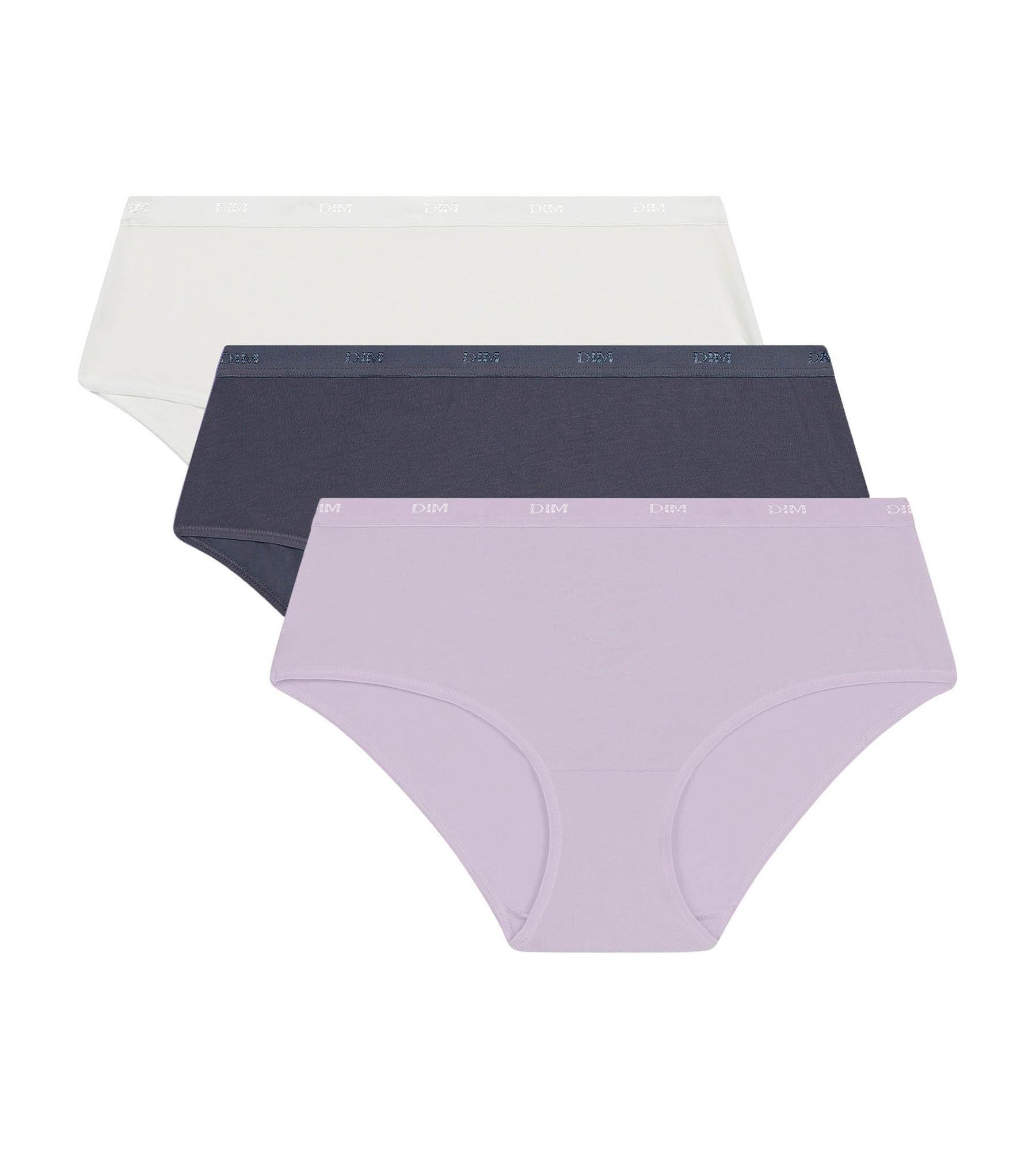 ¡Añade un toque de suavidad y modernidad a tu lencería con el Pack de 3 culottes de mujer Les Pockets EcoDim en algodón elástico Lila, Blanco y Azul!