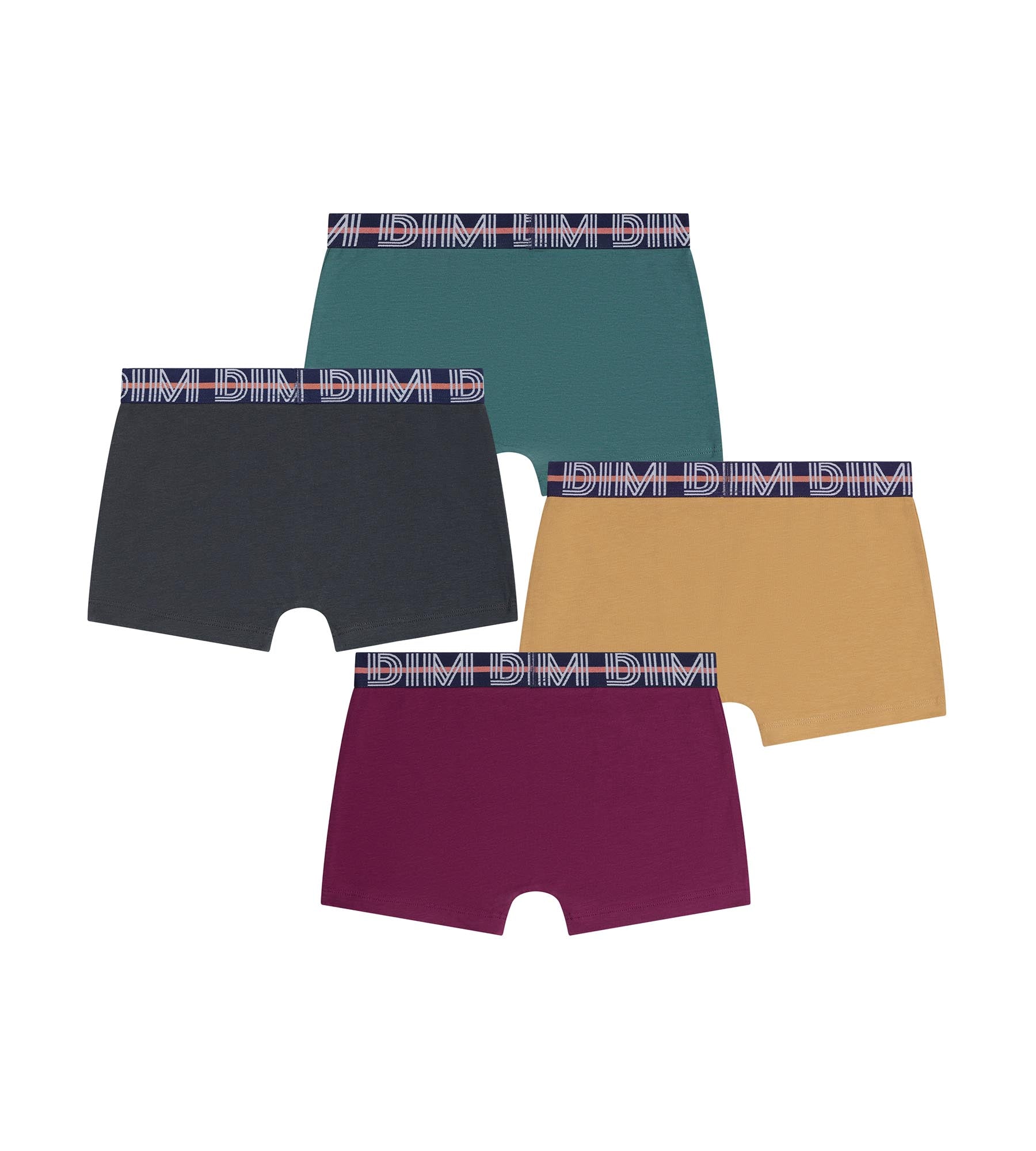 Con su tejido ultrasuave y tus colores burdeos, amarillo, ébano y verde, el pack de 4 bóxers para niño Dim Coton Stretch con cintura gráfica se convierte en el aliado cómodo para todos los días.