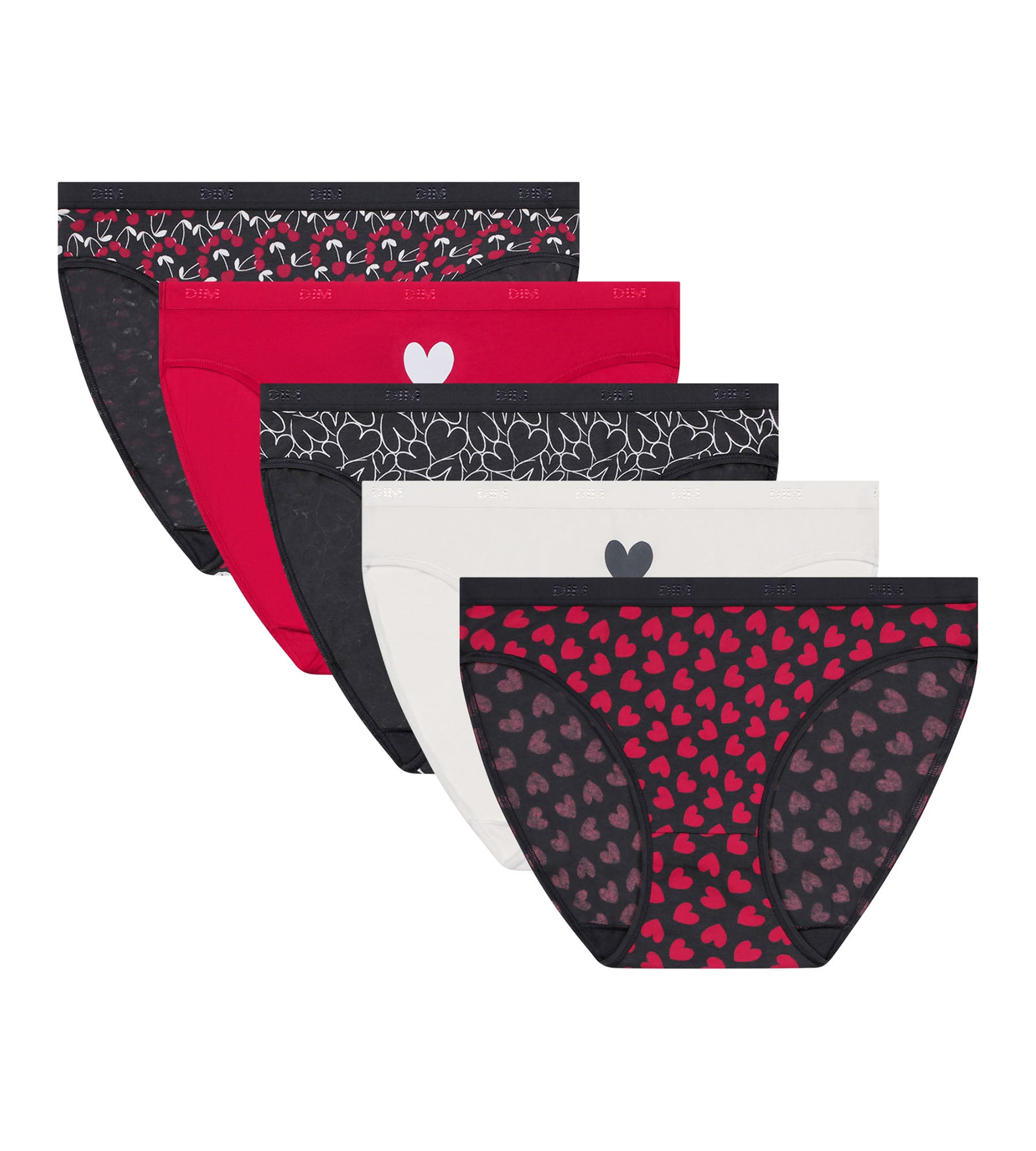 Con su paleta de colores rojo, negro y blanco, y sus variaciones de estampados en forma de corazón, el Pack de 5 culottes para mujer Les Pockets se atreve con los códigos del amor. Diseñadas para ser cómodas de llevar a diario, las bragas de algodón elástico para mujer Dim Pockets son flexibles, suaves y no comprimen la piel.