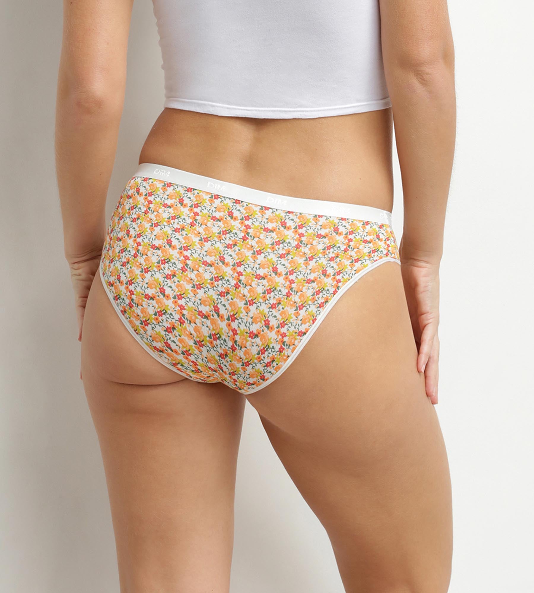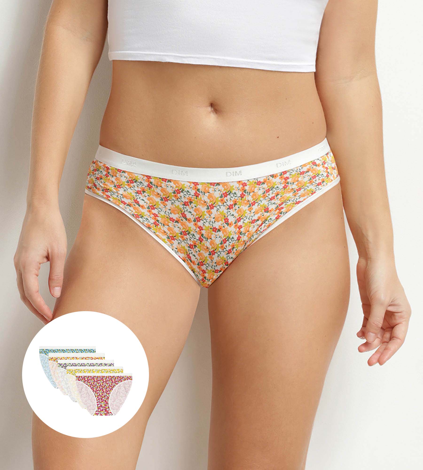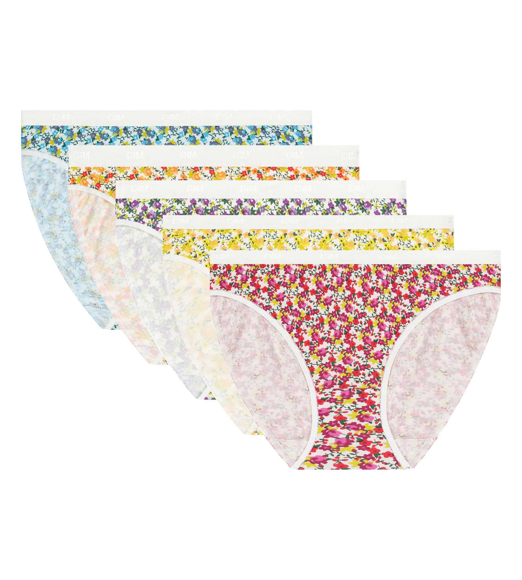 Añade un toque de fantasía a tu día a día con el pack de 5 braguitas de mujer Les Pockets de Dim, de algodón elástico y estampados florales.