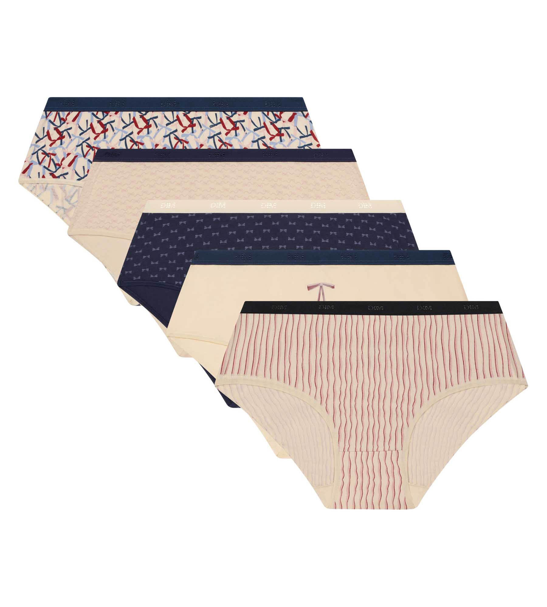 Añade un toque de suavidad a tu ropa interior con este pack de 5 calzoncillos bóxer para mujer Dim Les Pockets con delicados motivos de lazos.