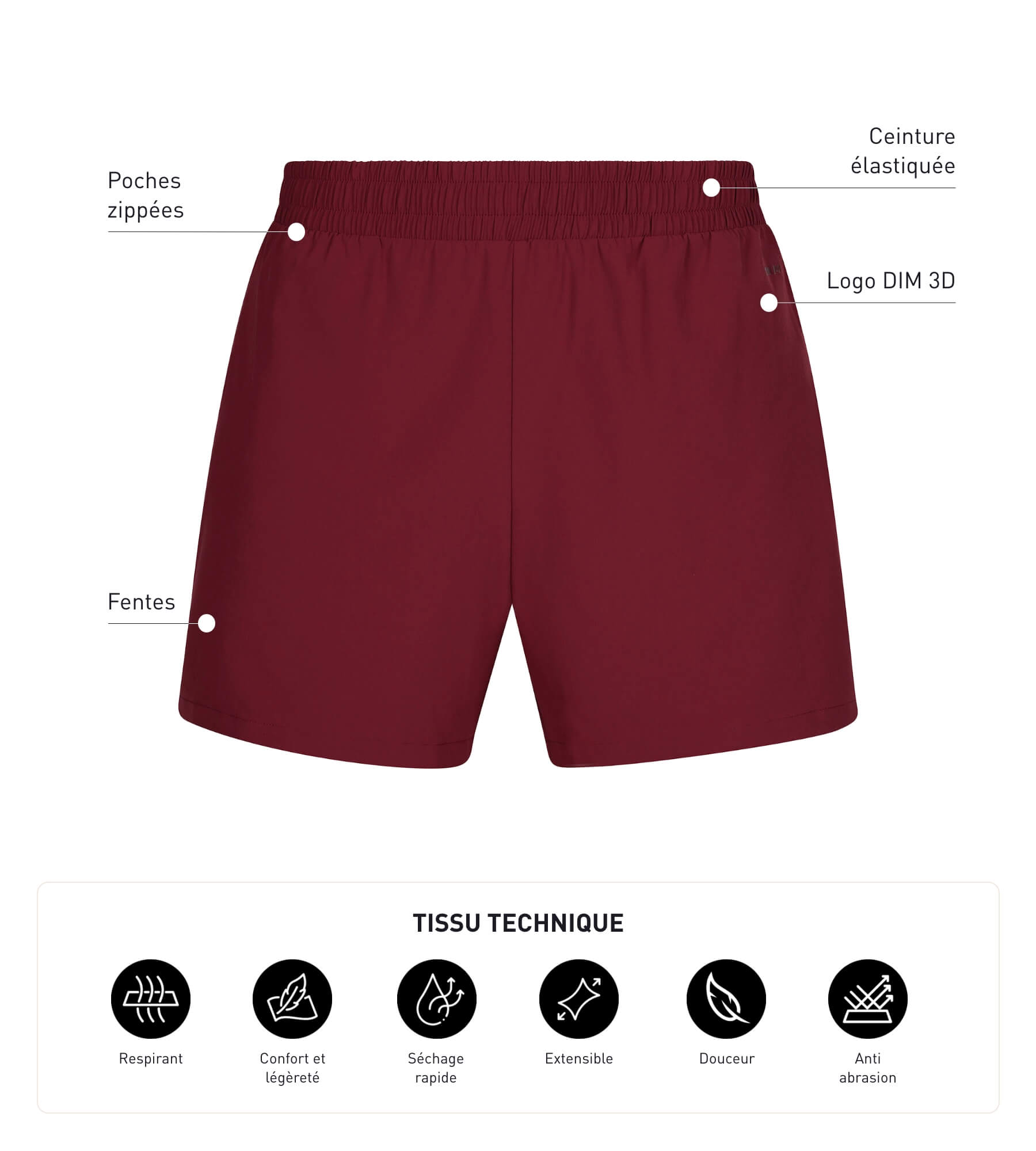 Viste con la ropa deportiva más cómoda, ligera, flexible y transpirable todo el año. Una gran adición a tu colección será el pantalón corto deportivo de hombre en tejido vaporoso burdeos Dim Move. ¡Ya verás!