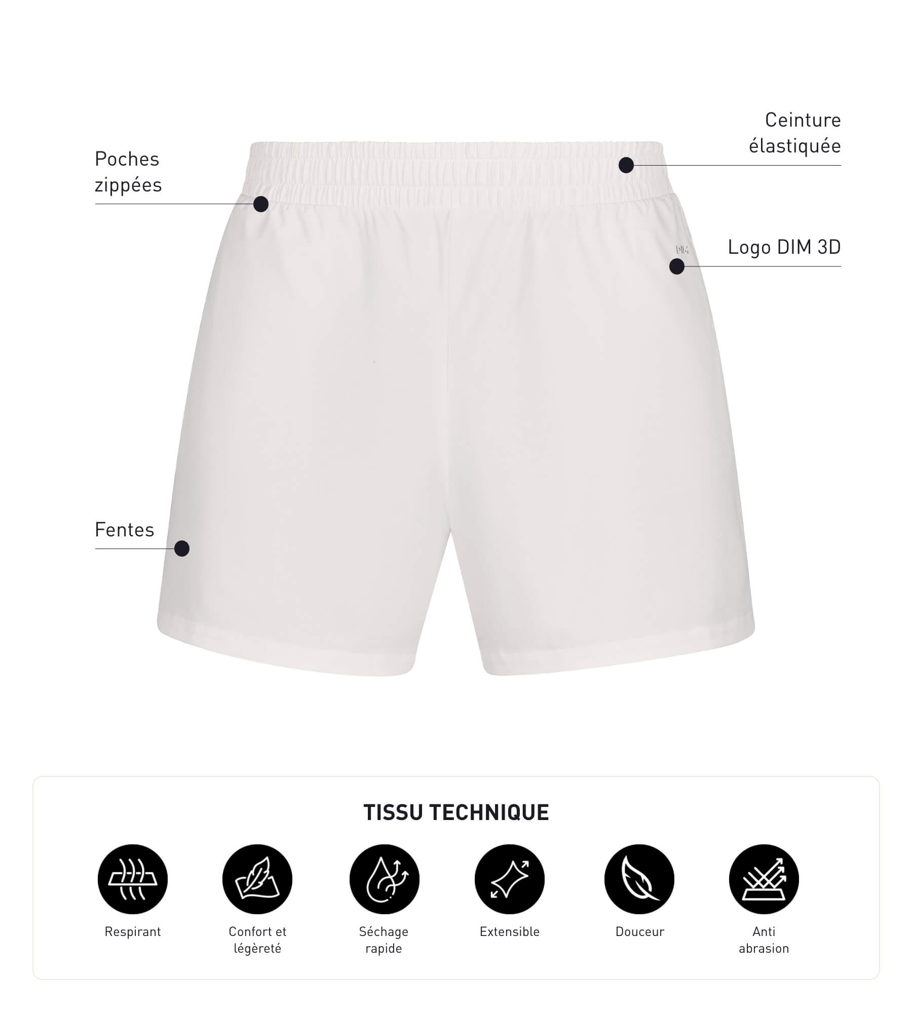 Escoge una ropa deportiva de calidad y estilosa para tus sesiones de cardio o tu deporte favorito. El pantalón corto deportivo de hombre en tejido vaporoso crudo Dim Move será tu gran aliado por sus múltiples ventajas prácticas.