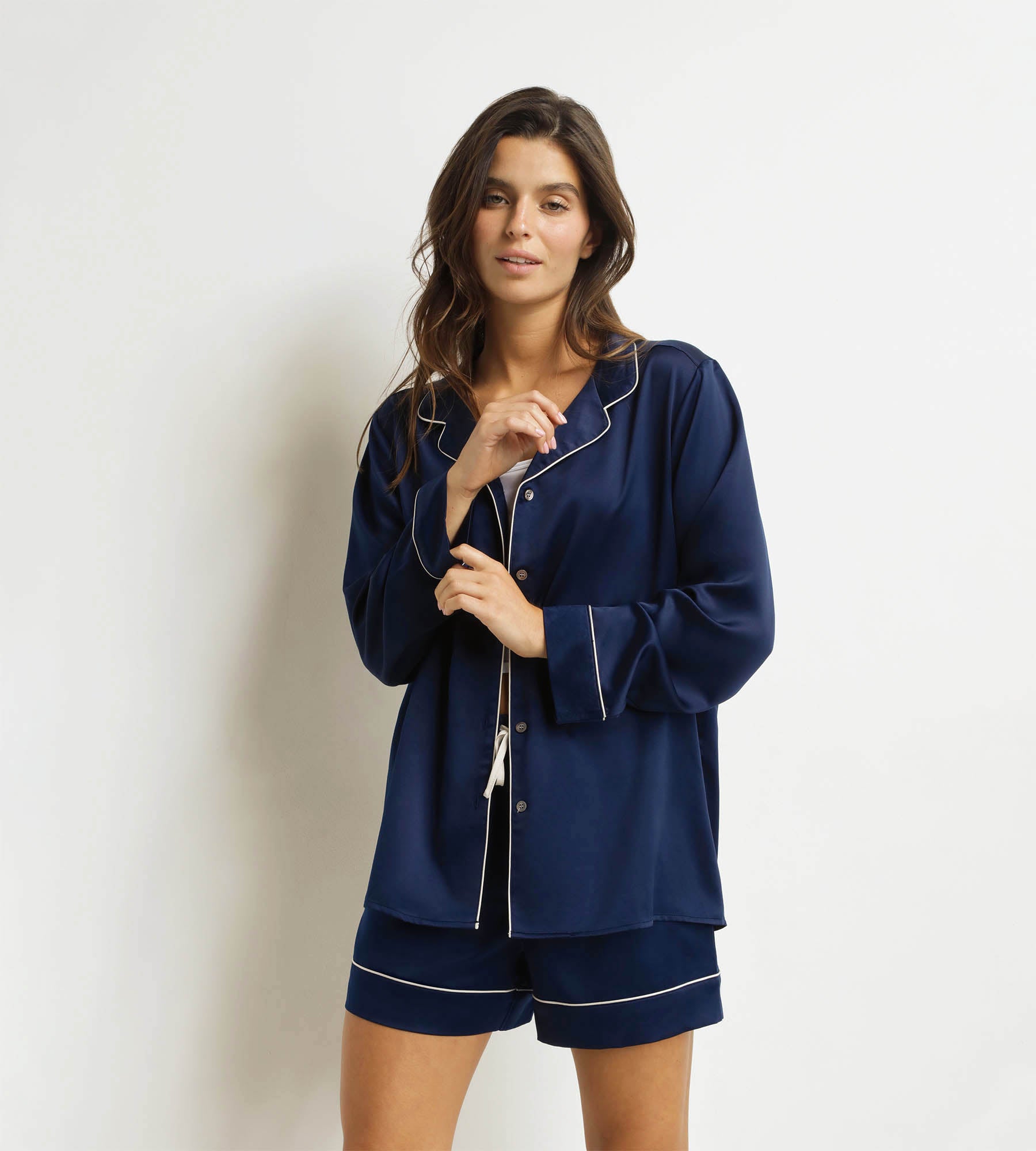 Ligero y refinado, opta por el pijama corto de satén azul medianoche para mujer Dim Don’t Disturb, para noches de rêve!