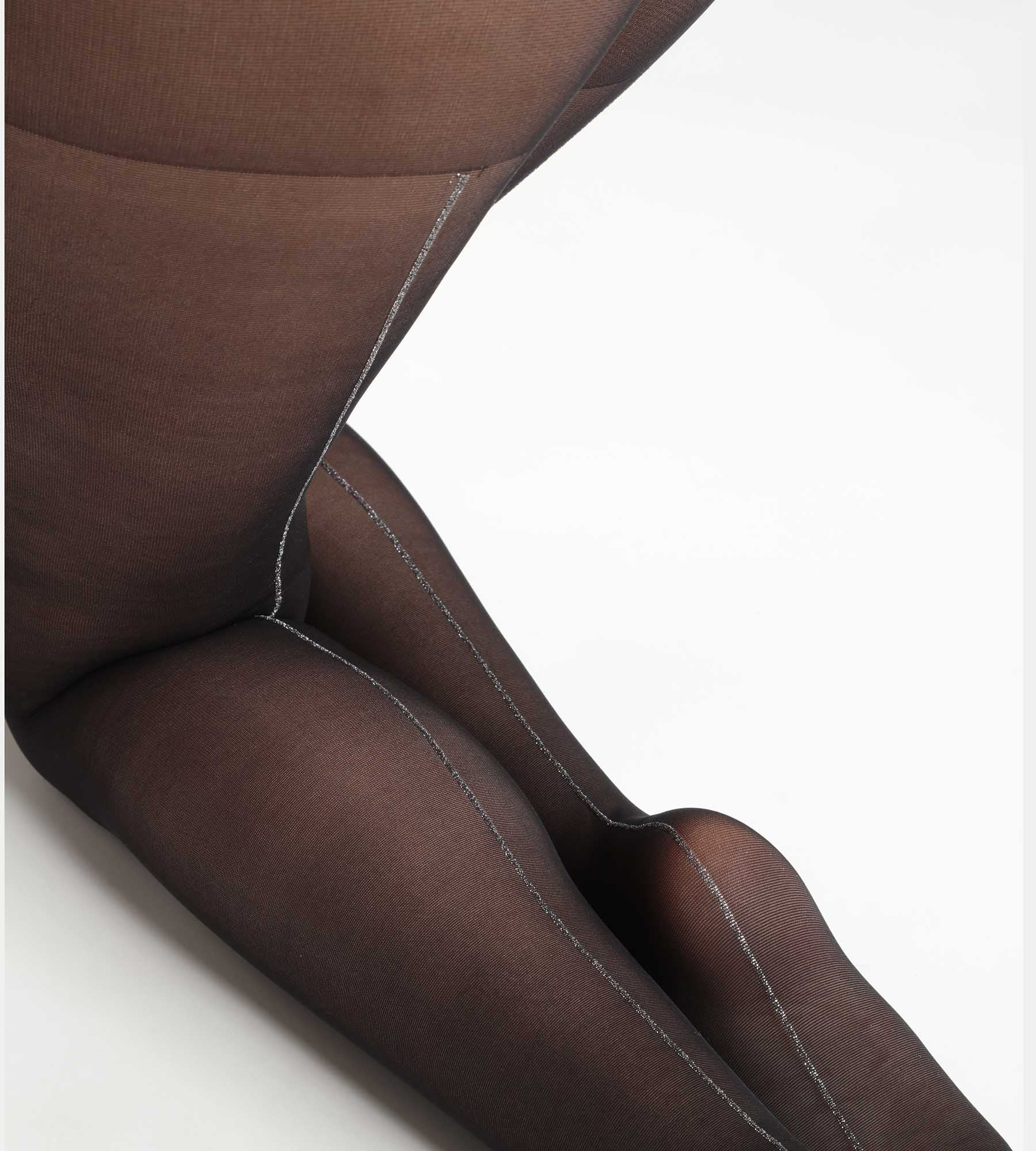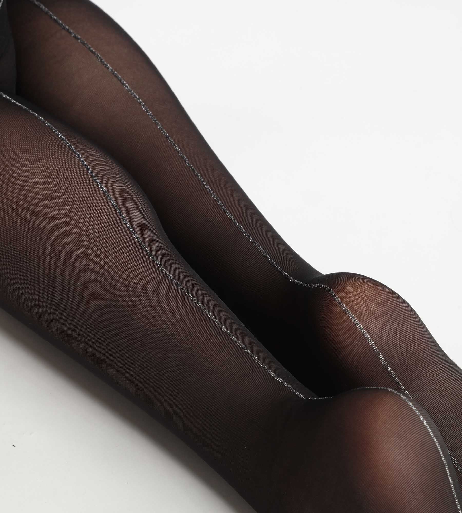 Confeccionado para las ocasiones más especiales, este panti transparente negro con banda plateada de lúrex es muy festivo y glamuroso.
