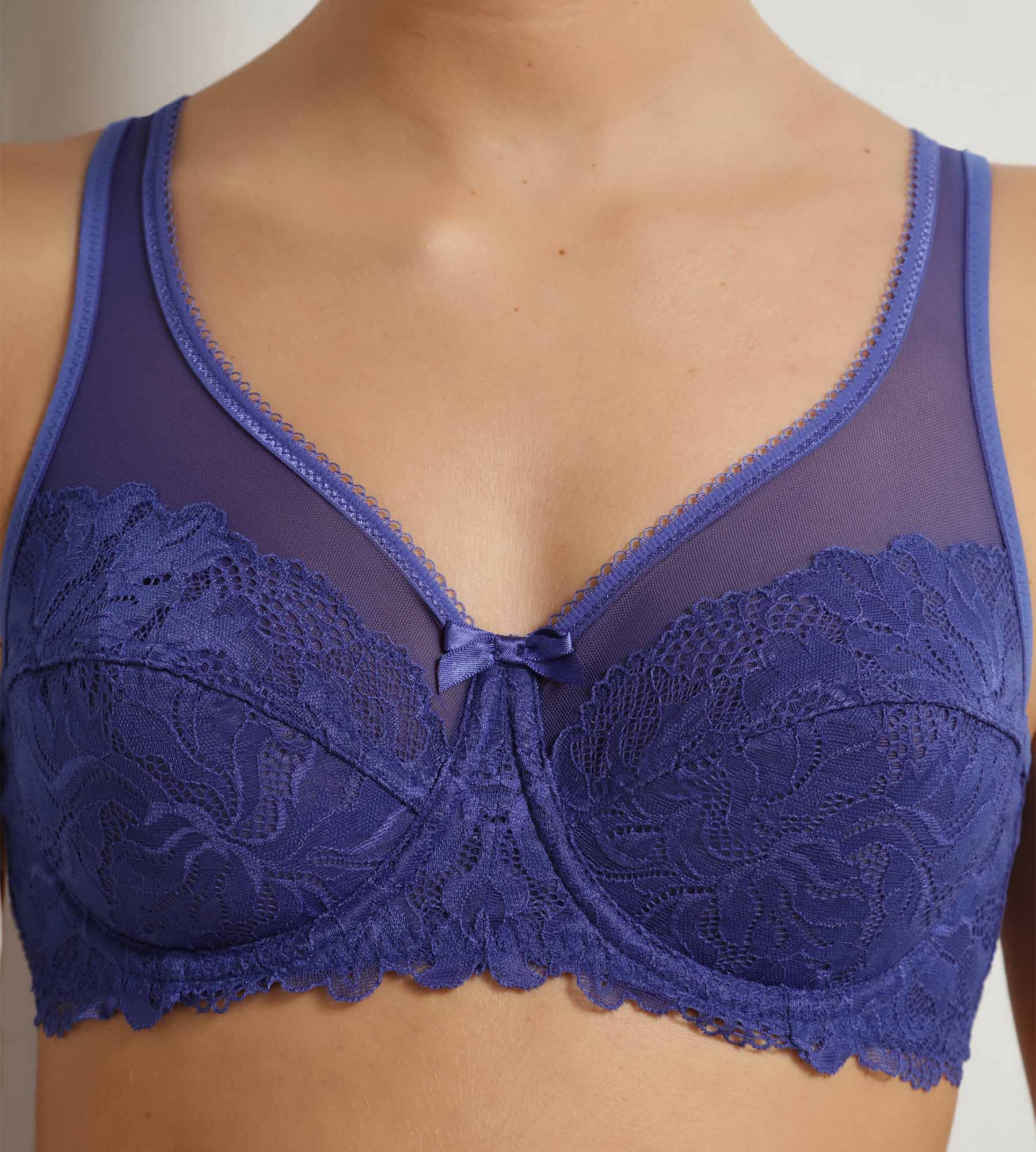 Combina sujeción y elegancia con el sujetador con copas Generous Essentiel Dim, en encaje azul capitán con un encanto atemporal.
