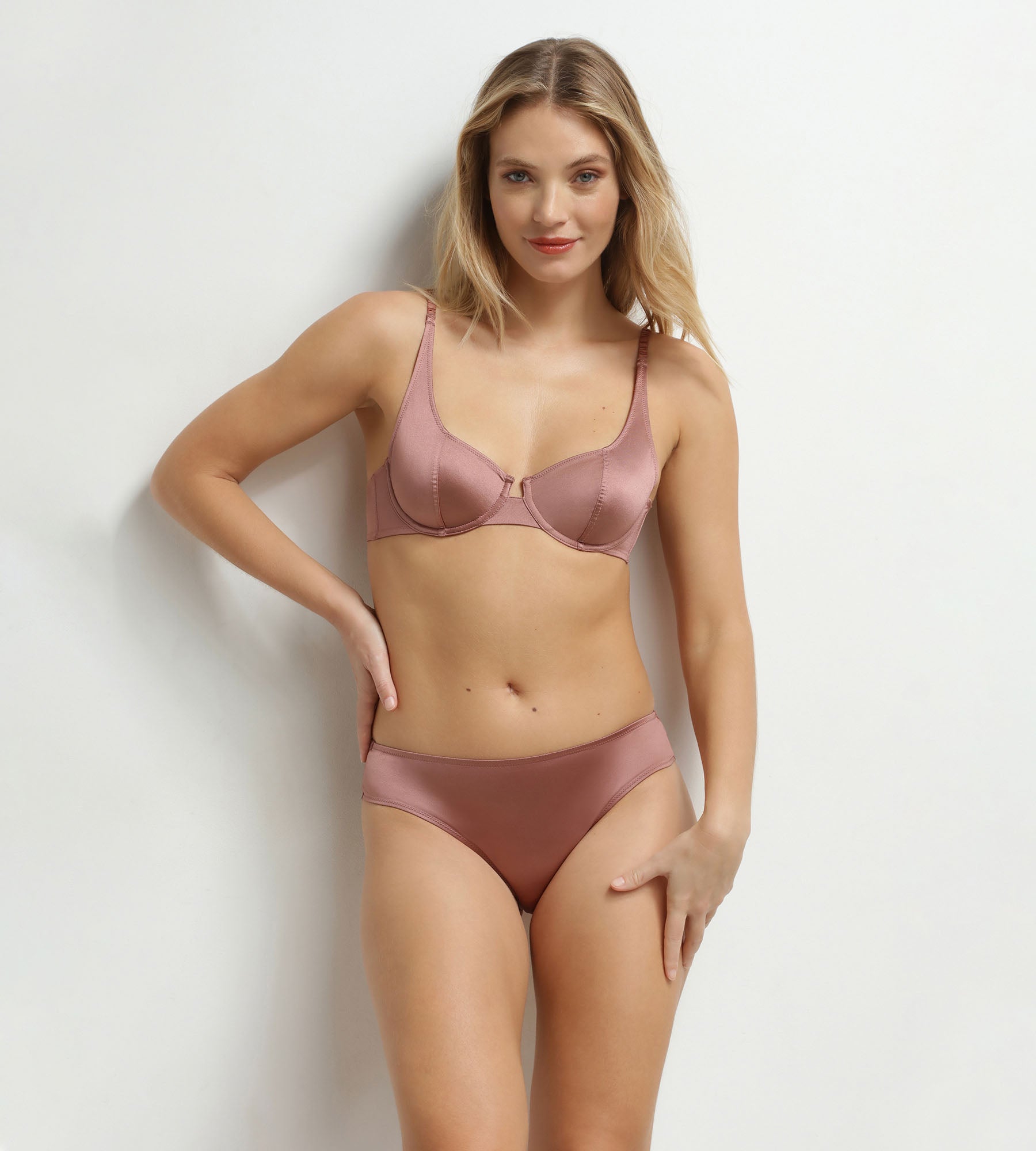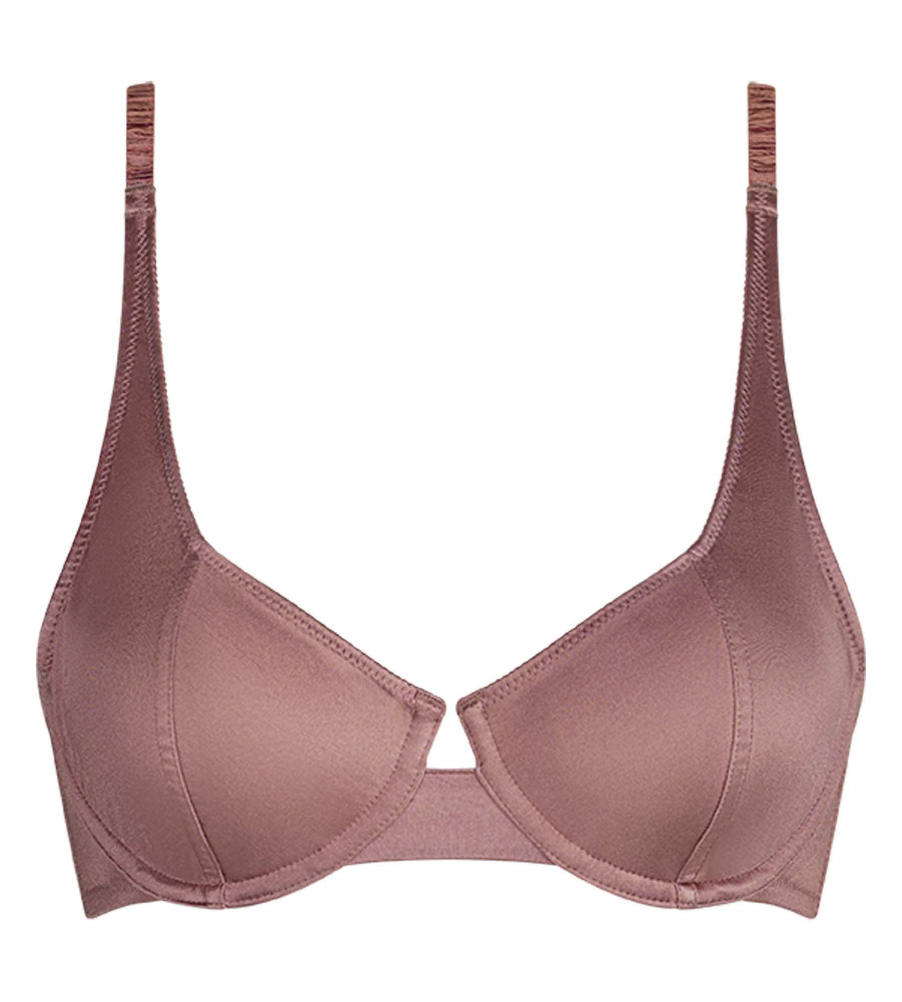 Te encantará: • El satén suave con textura lisa • La estructura balconette con aros y costura vertical, para una sujeción segura • El color marrón brillante, muy chic • Los acabados limpios: bordes nítidos, tirantes fruncidos, ajustadores dorados discretos • La comodidad pensada al detalle: espalda en U estabilizadora y entrepecho estrecho que aligera la línea