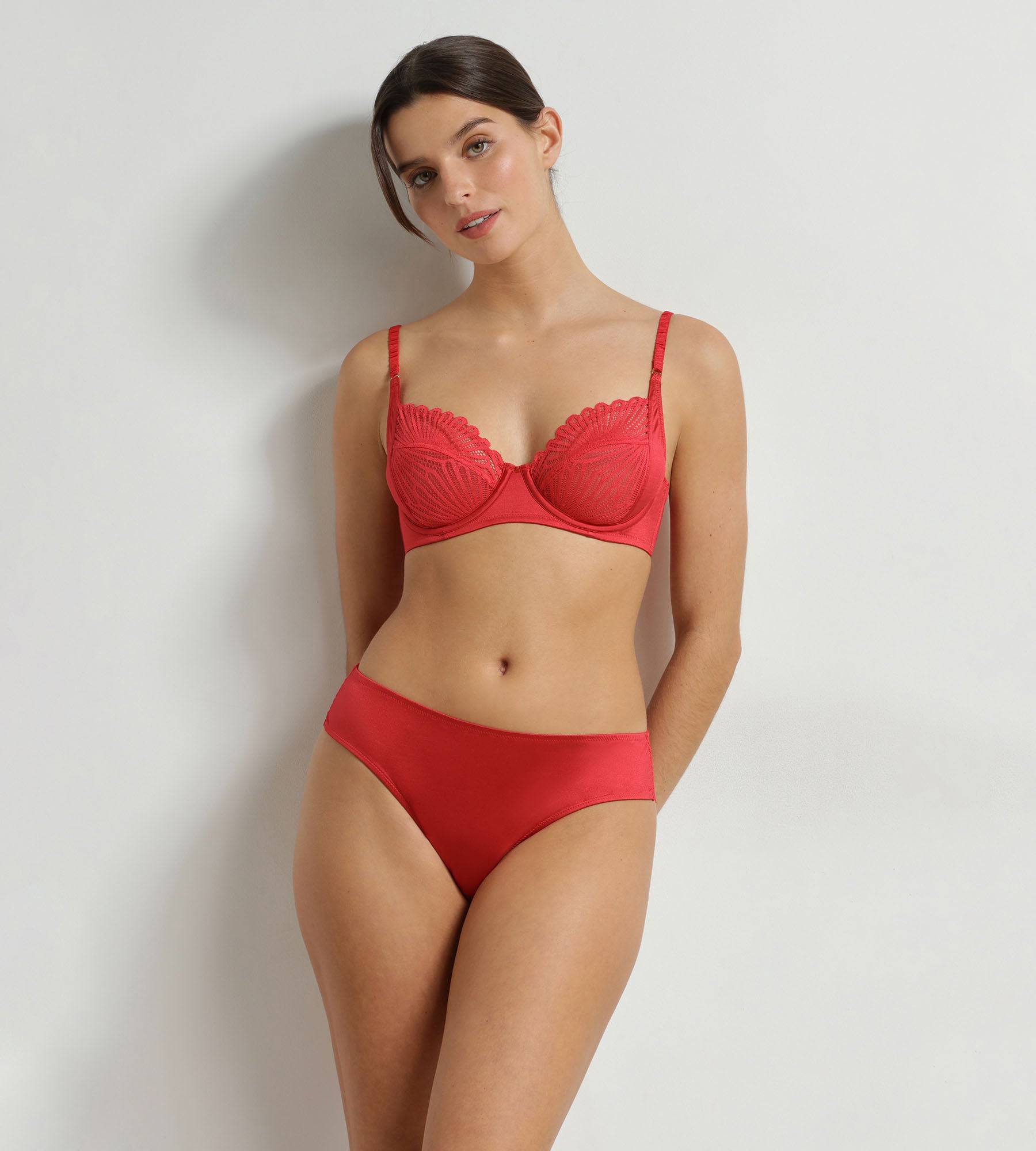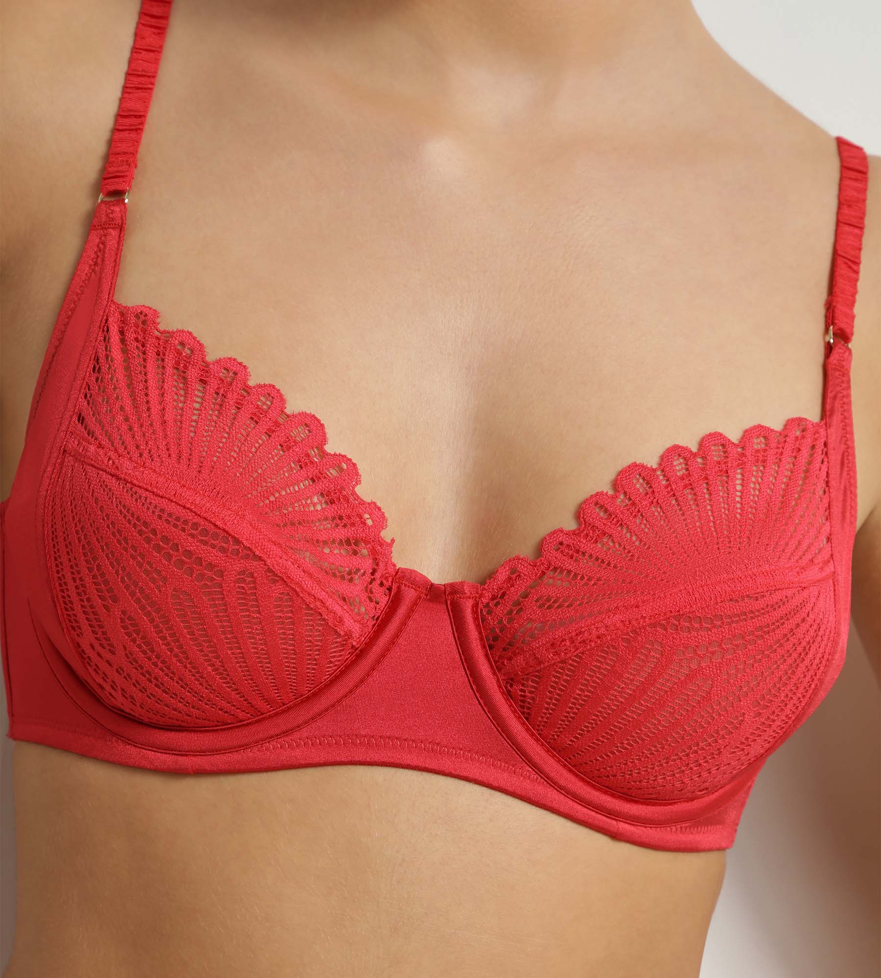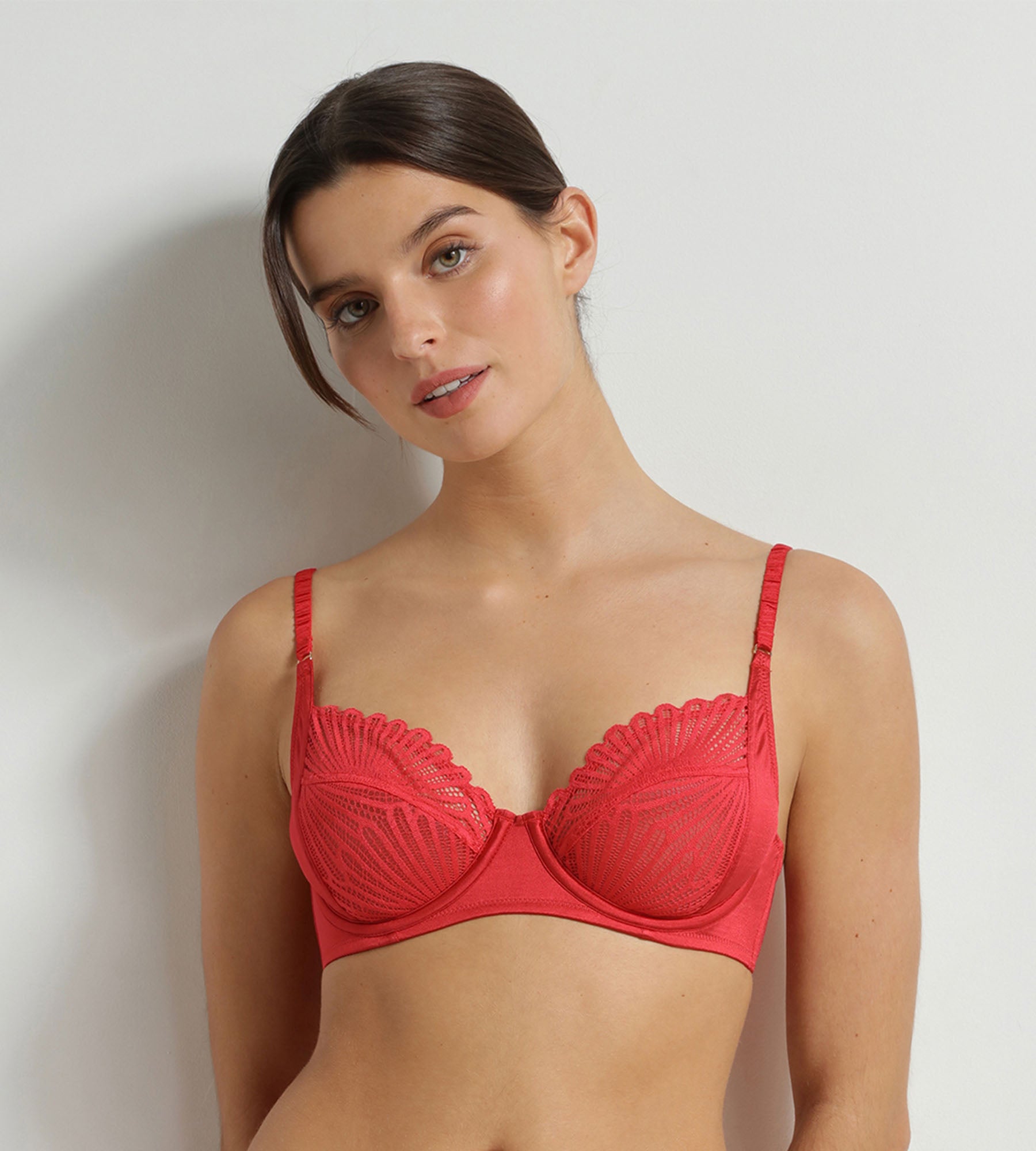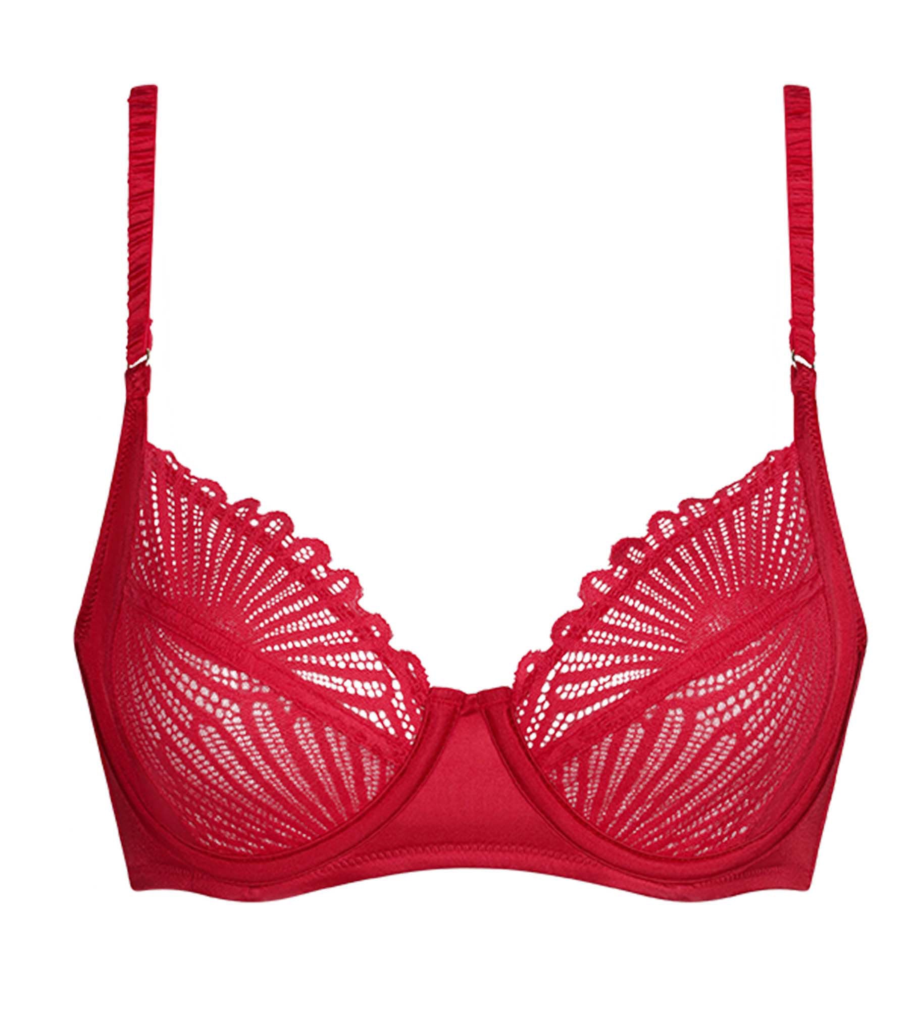 Con su delicado encaje y su satén luminoso, el sujetador rojo con aros Dim Chocolove combina sujeción y sensualidad en un elegante corte envolvente.