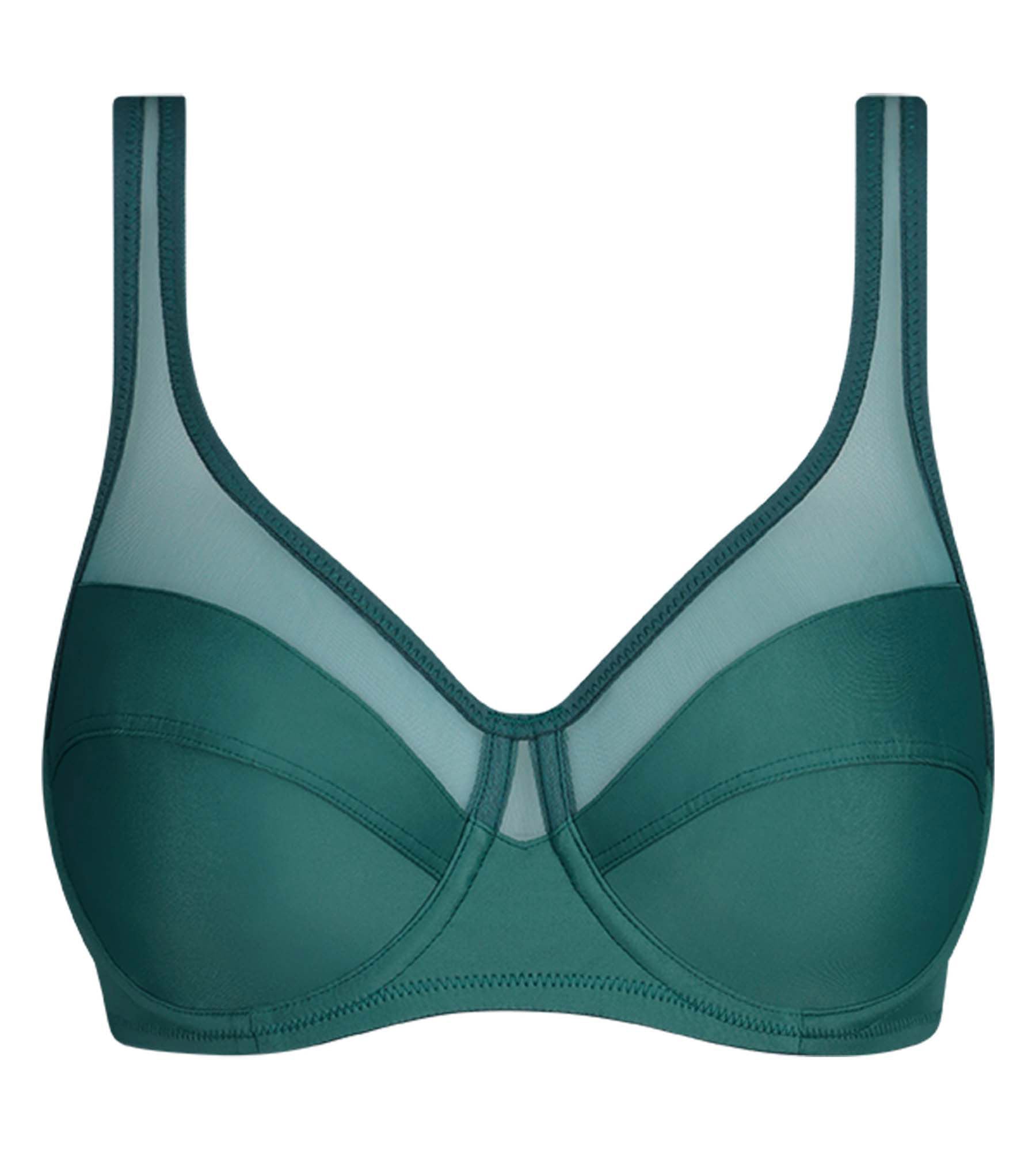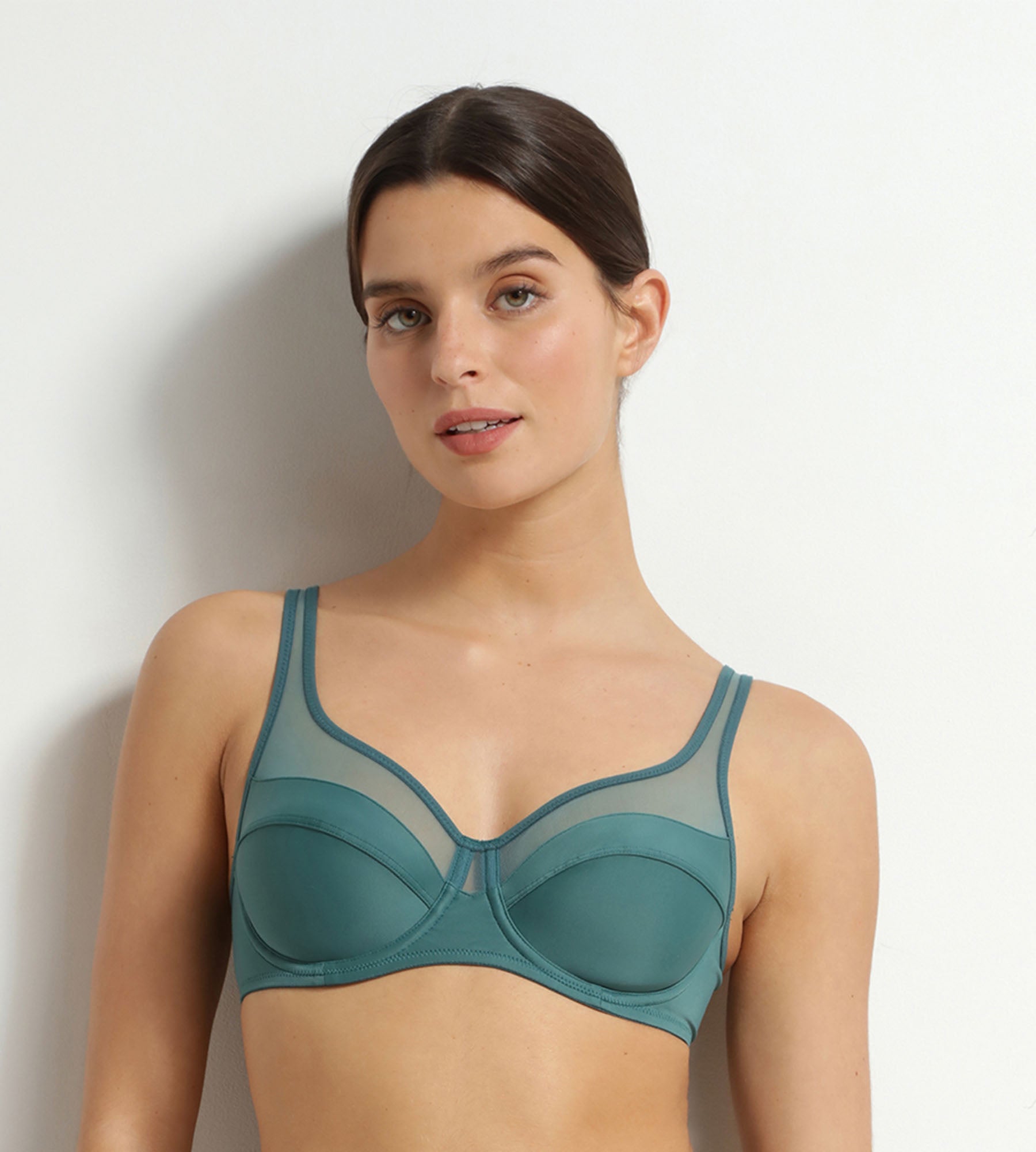 Elegante y eficaz, apuesta por el sujetador con aros Dim Generous de microfibra y tul verde esmeralda.