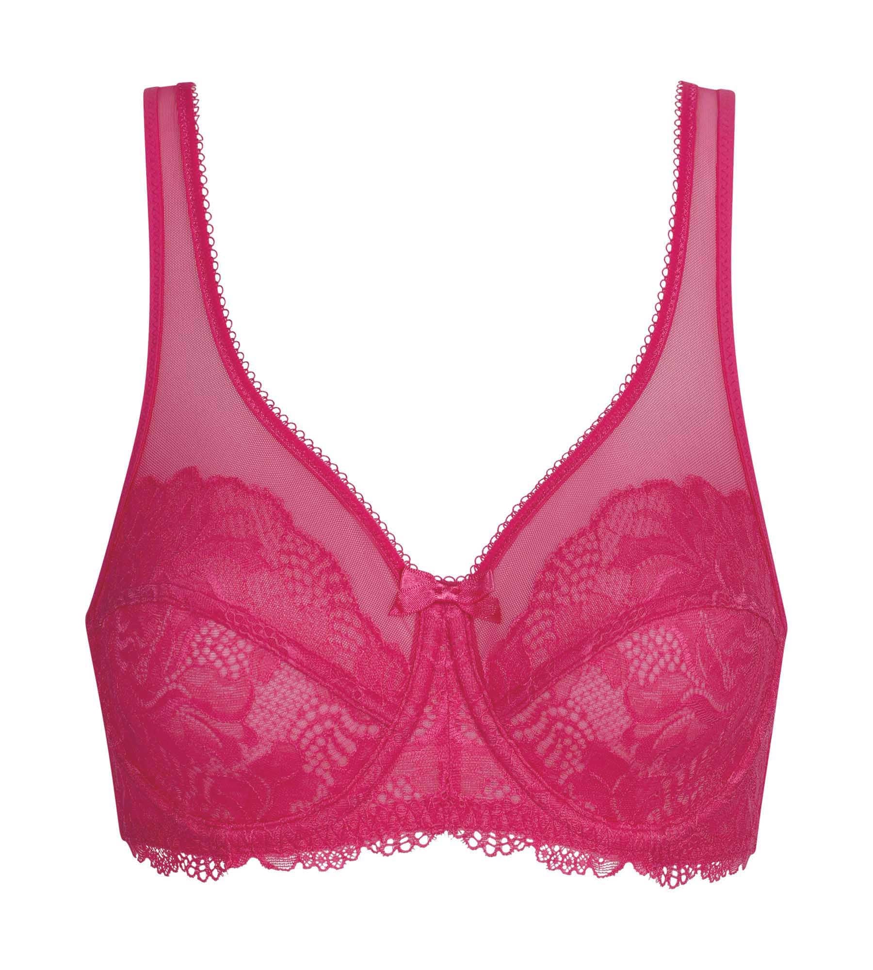Déjate seducir por el look ultrafemenino del sujetador Generous Essentiel de Dim en encaje fucsia intenso.