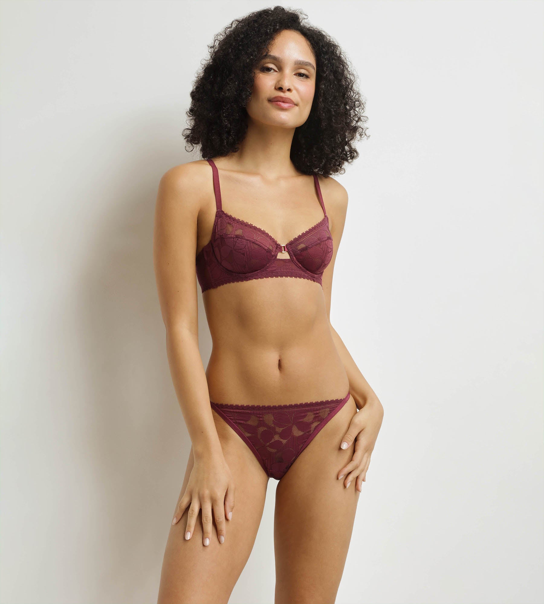 Diseñado para combinar comodidad y estilo, el sujetador de encaje para mujer Dim Art Flower juega con las transparencias para un efecto a la vez gráfico y delicado. Su forma entrelazada sujeta perfectamente el busto gracias a sus copas semi forradas y sus discretos aros. La espalda ancha en forma de U y el bajo elástico bajo el encaje aportan una sujeción estable sin renunciar a la suavidad. Con su color Figue y su copa central enjoyada, este sujetador con aros revisita el espíritu vintage de los años 70 con un toque moderno.