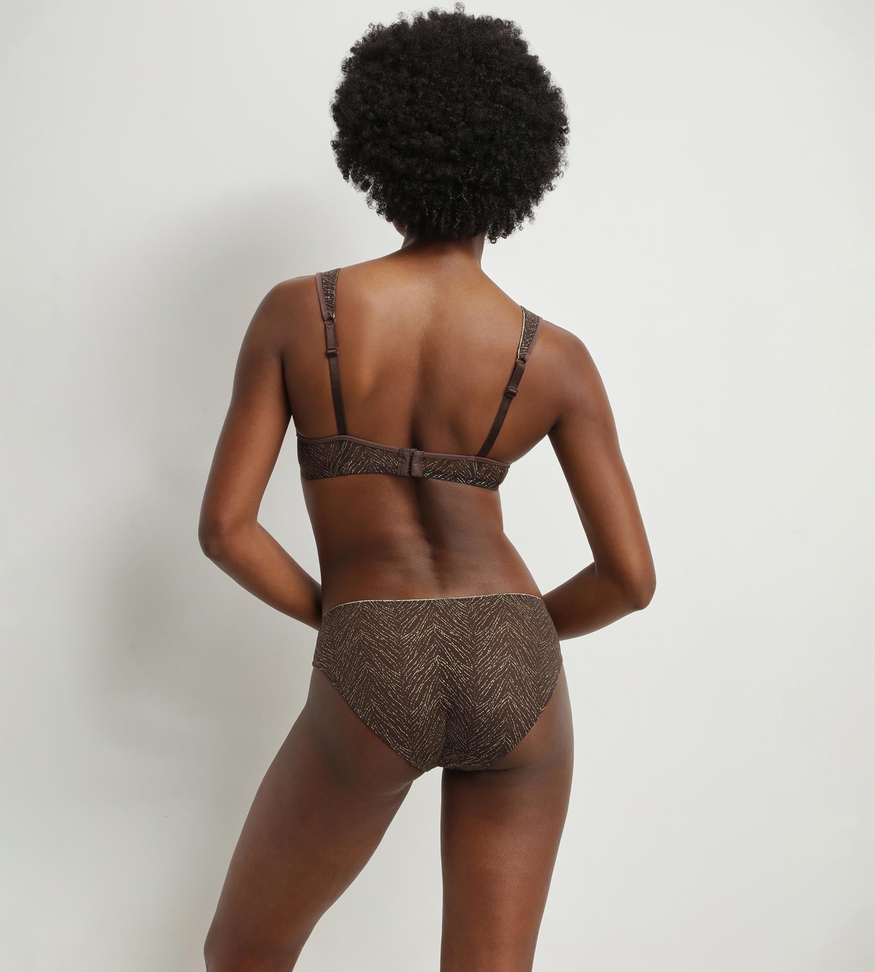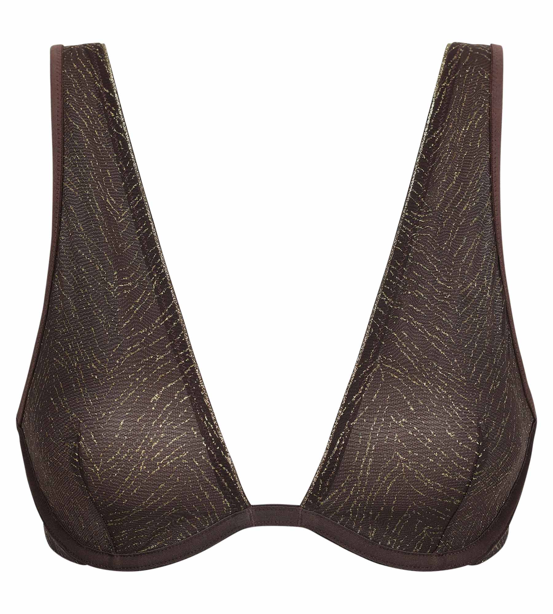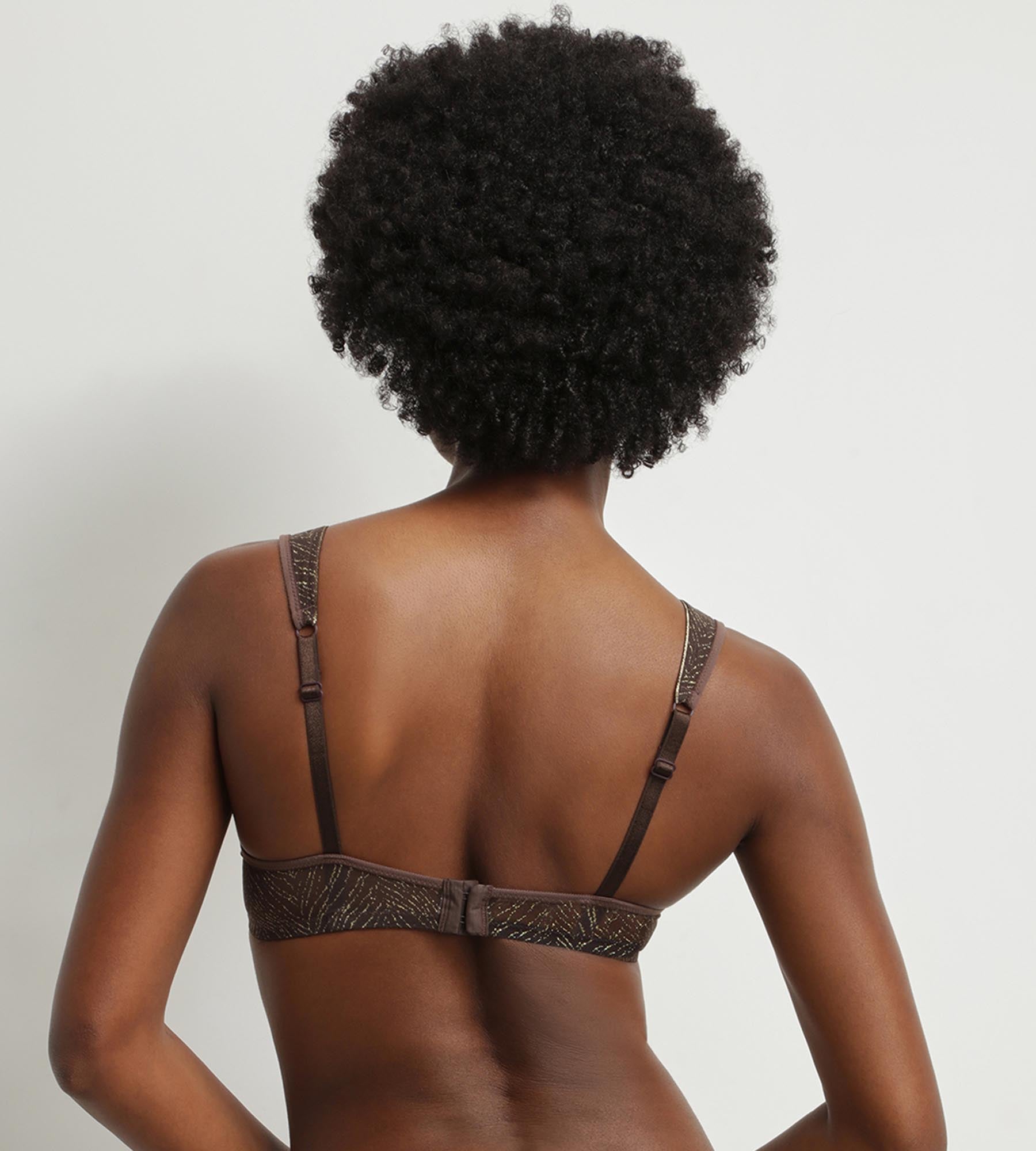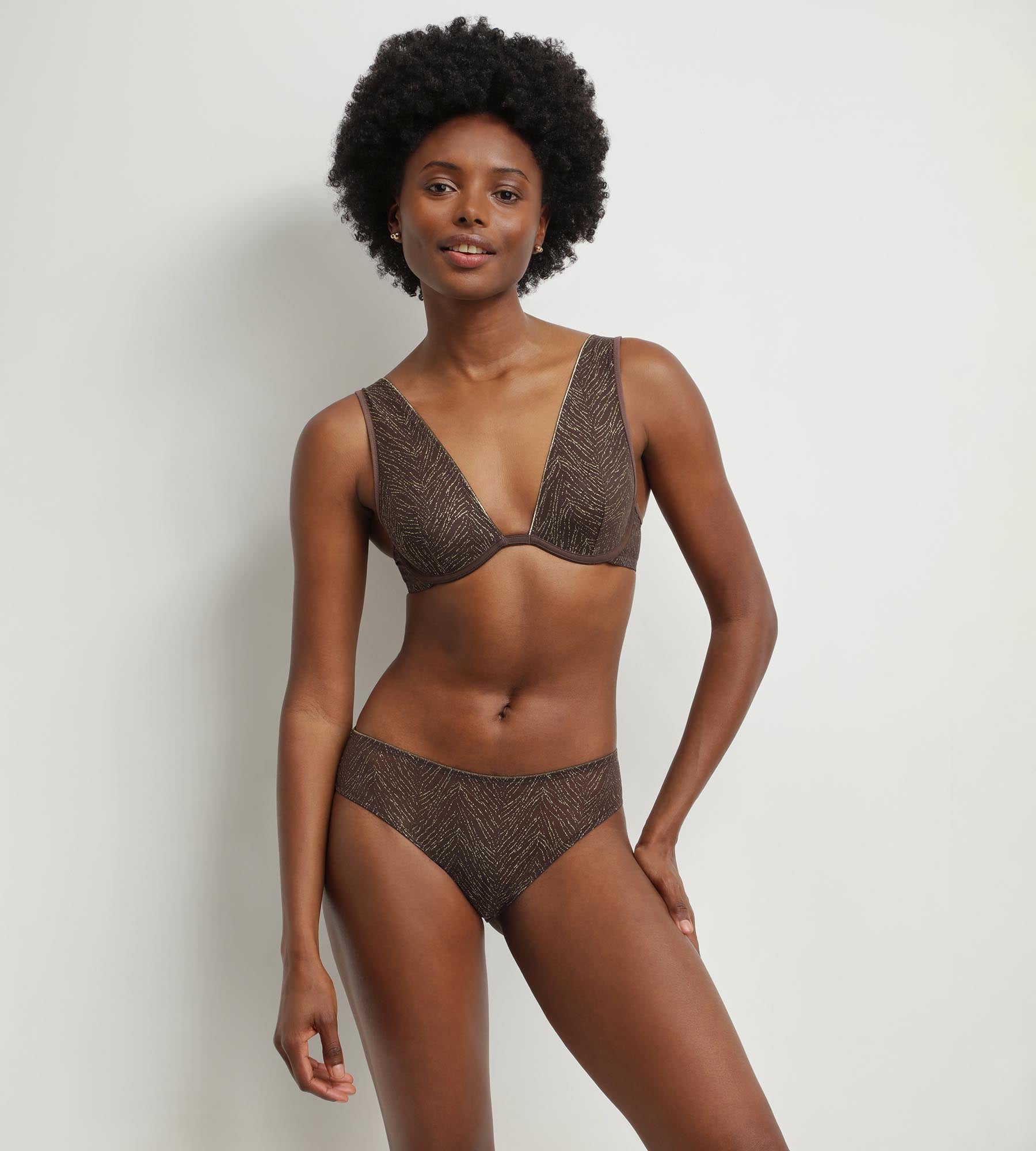 Suave y envolvente, este bonito sujetador triangular marrón preserva la forma natural del pecho y acentúa el escote. En este caso con aspecto más lujoso gracias a su estampado brillante.