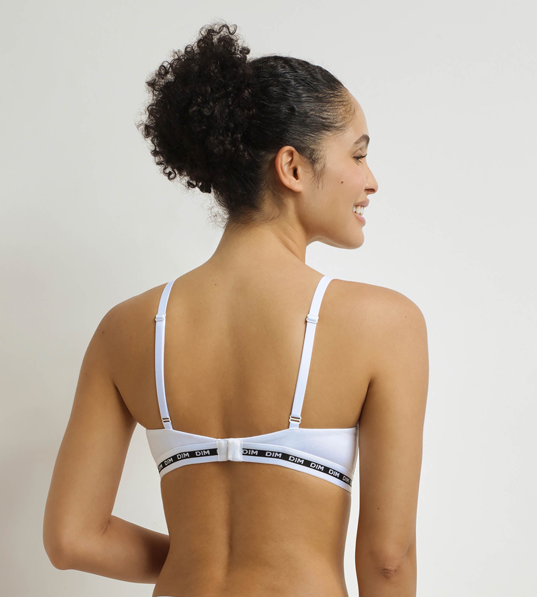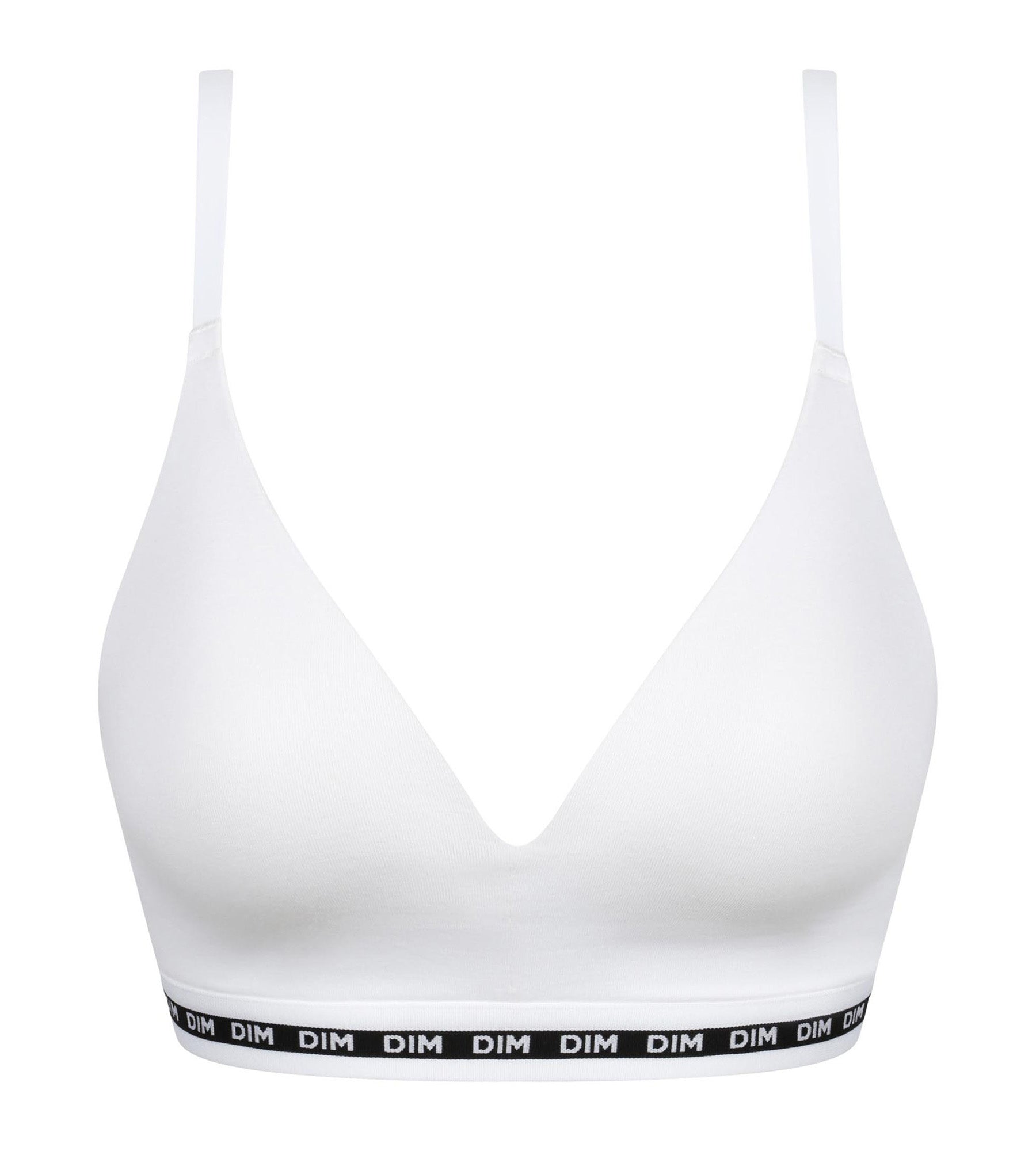 Este sujetador sin aros Dim Icons de algodón modal blanco está diseñado para combinar sujeción ligera y libertad de movimiento. Diseñado con copas acolchadas, este sujetador triangular envuelve el busto y le da una forma redondeada, para un bonito escote. Gracias a su material elástico, este cómodo sujetador acompaña todos tus movimientos con facilidad. El color blanco es sobrio y luminoso, apto para todos los tonos de piel e invisible bajo tops claros. Por último, el sujetador beige élastic basque à el logotipo Dim realza y sujeta el busto con estilo.