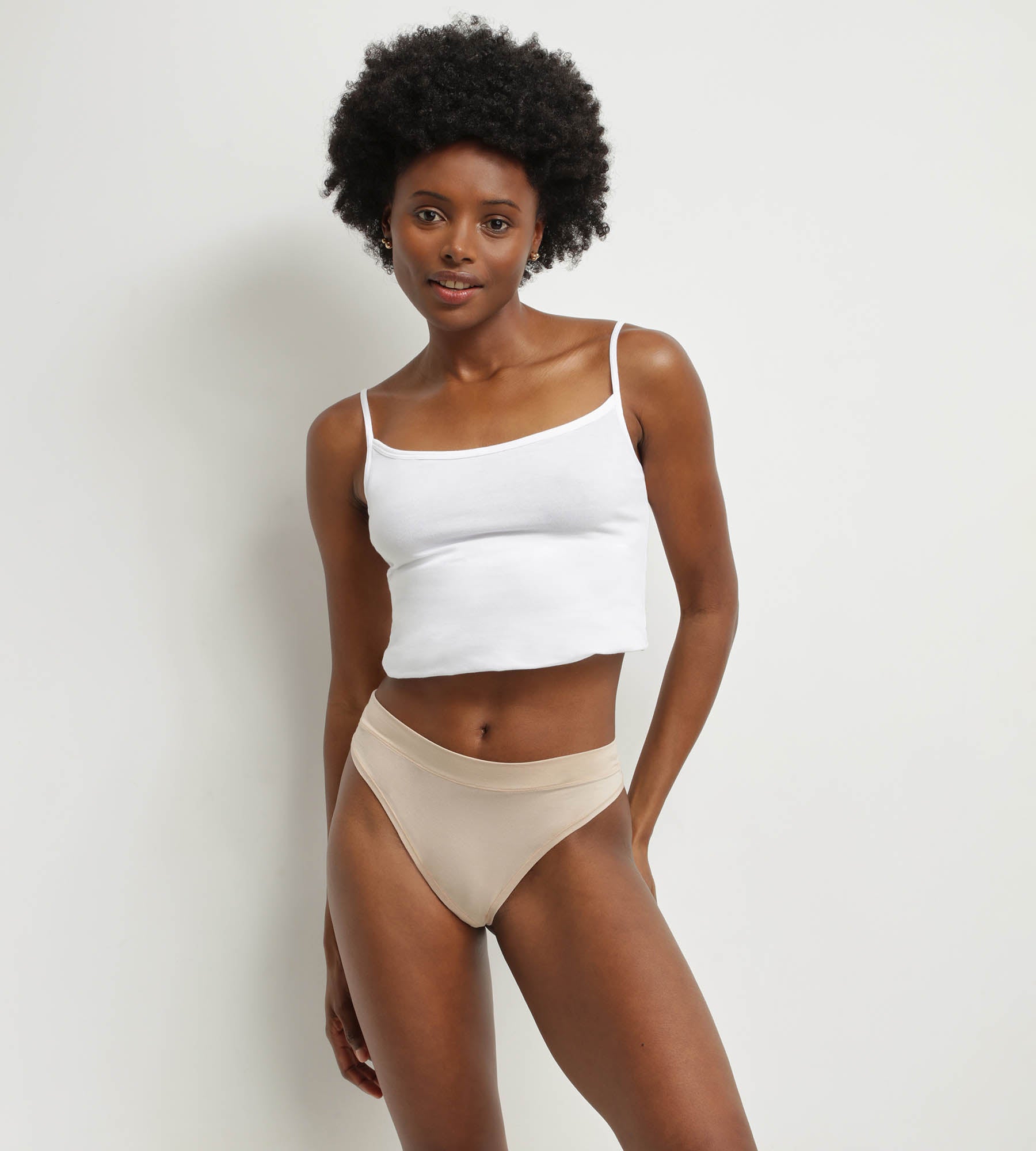 - El diseño clásico a base de costuras planas y corte invisible de este tanga en color nude o maquillaje.
