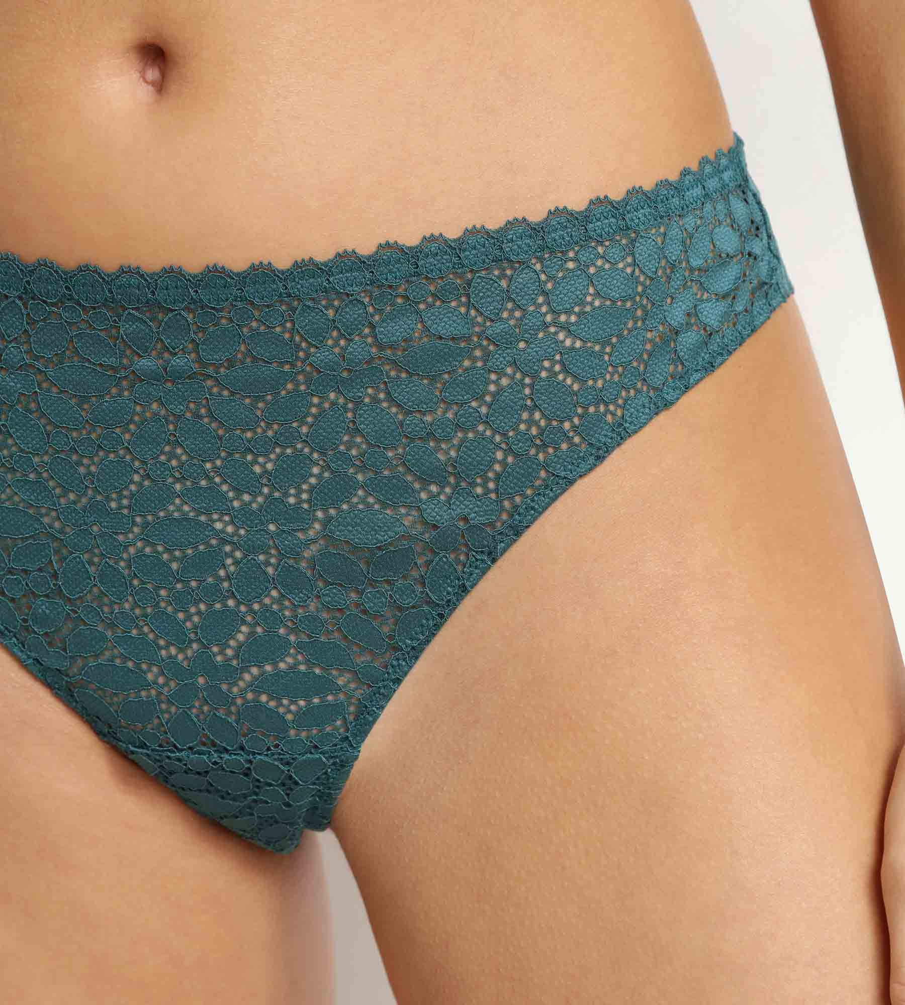 Un poco retro, tremendamente femenino: el tanga Daily Dentelle verde esmeralda aporta un toque de color y ligereza a tu lencería de diario.