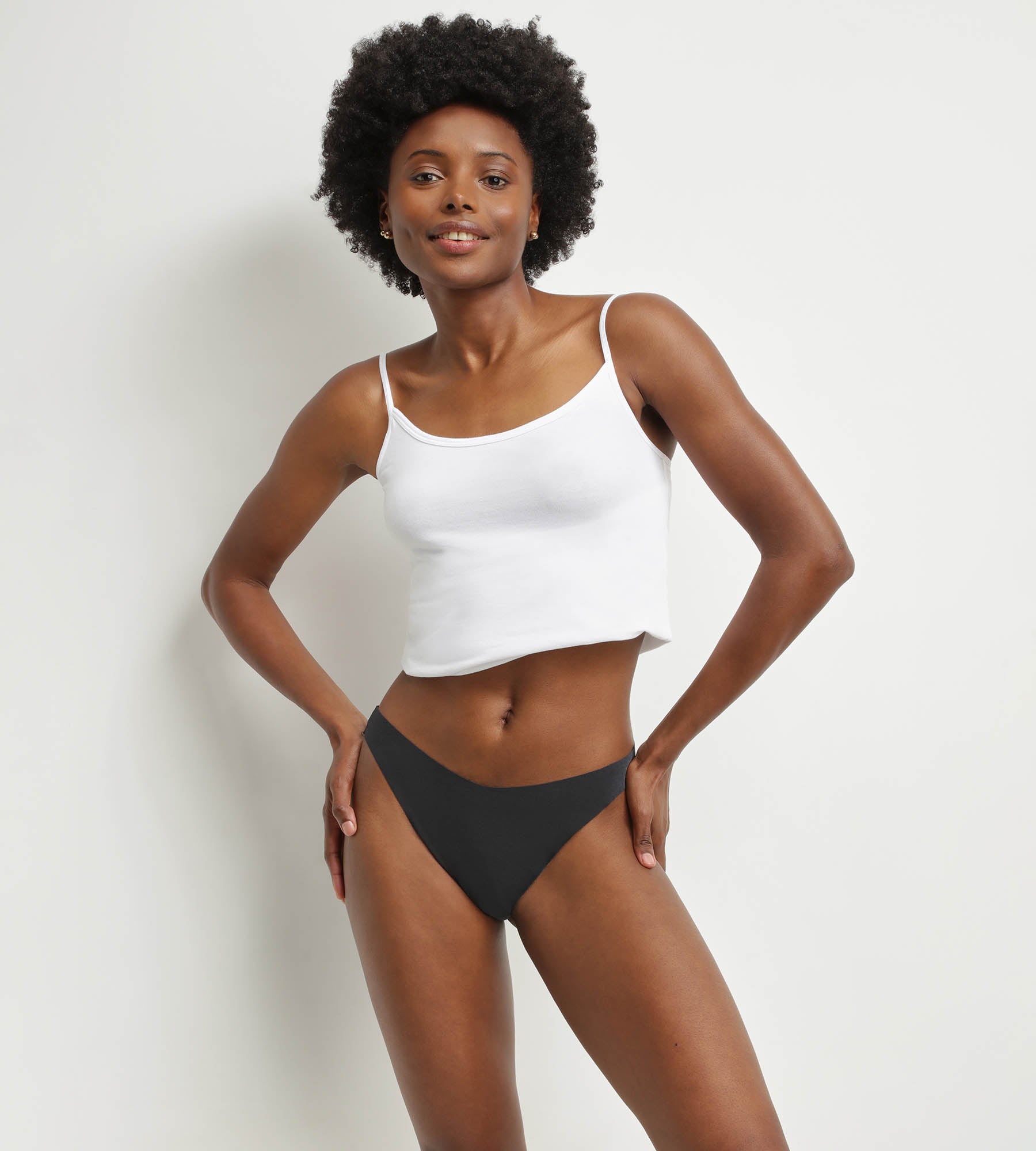 Ropa interior minimalista y práctica para tu día a día, hagas ejercicio o no. Los bordes planos de este tanga negro hacen que no moleste en todo el día. Déjate seducir por la silueta de esta pieza de lencería invisible y amable con la piel. Se funde con tu piel y te permite hacer todo tipo de movimientos.
